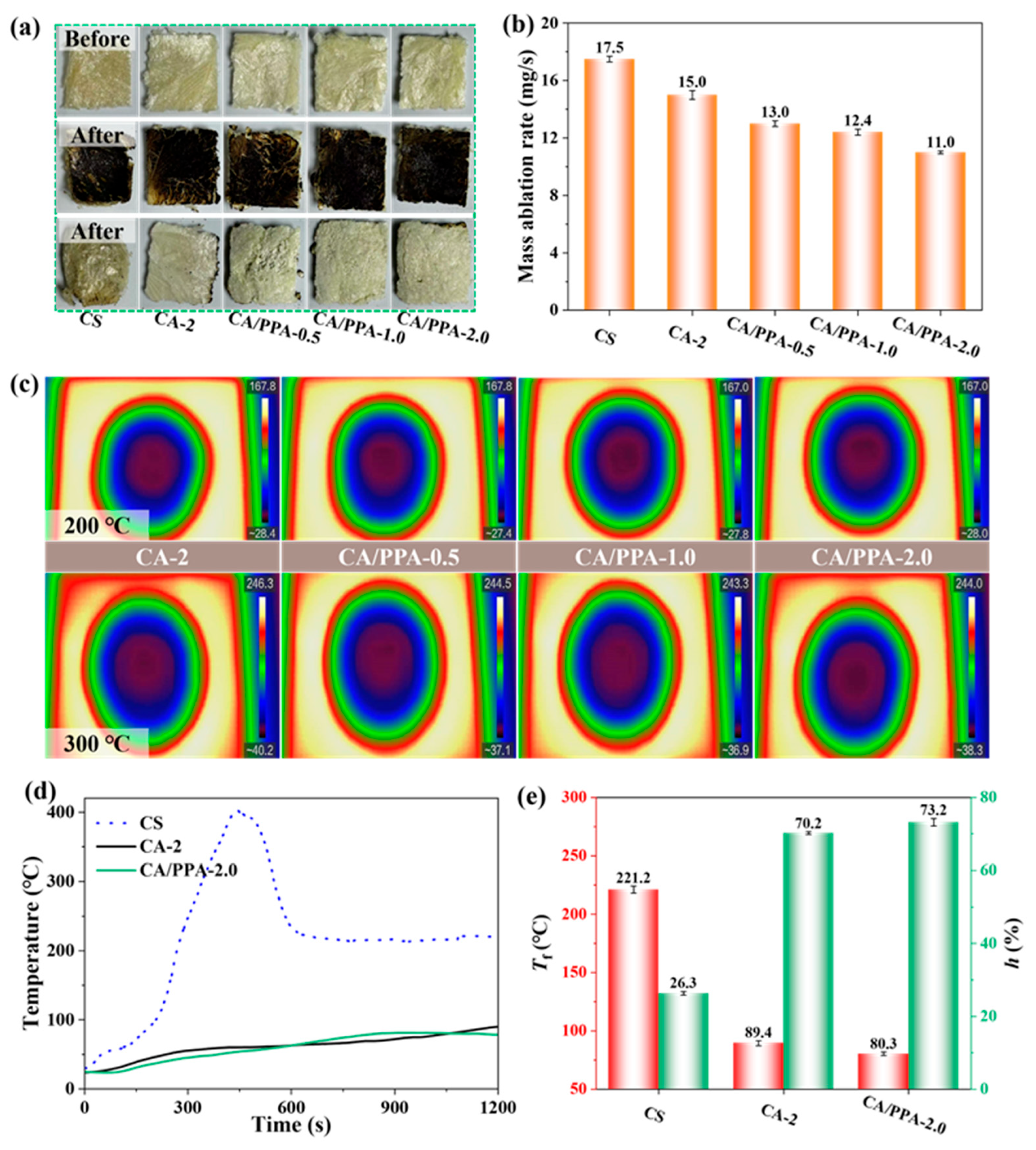 The fire resistance evaluation of the aerogels was conducted under 10 s sustained ignition conditions, as detailed in Figure S3. The continuous fire source was a flame gun fueled by acetylene gas, with a flame temperature capable of reaching 1000 °C. The test results in Figure 9a reveal that neat CS aerogel burned quickly. Furthermore, all CS, CA-2, and CA/PPA-0.5 aerogels exhibited significant shrinkage when exposed to fire. Cross-sectional images of CA/PPA-1.0 and CA/PPA-2.0 aerogels reveal that the interior retained its original morphology and color after combustion, demonstrating that PPA effectively protected the inner CA-2 matrix. It is notable that increasing the PPA loading in CA-2 resulted in a more complete carbonized layer on the surface. Specifically, the CA/PPA-2.0 aerogel formed a continuous carbon layer, which prevented the transfer of flames and heat. The mass ablation rate (the change in sample mass before and after the test divided by the test time) is applied to evaluate the fire resistance, and presented in Figure 9b. A lower mass ablation rate indicated a higher fire resistance [11]. Among all of the aerogels, the CA/PPA-2.0 aerogel obtained the lowest mass ablation rate, indicating the excellent fire resistance.