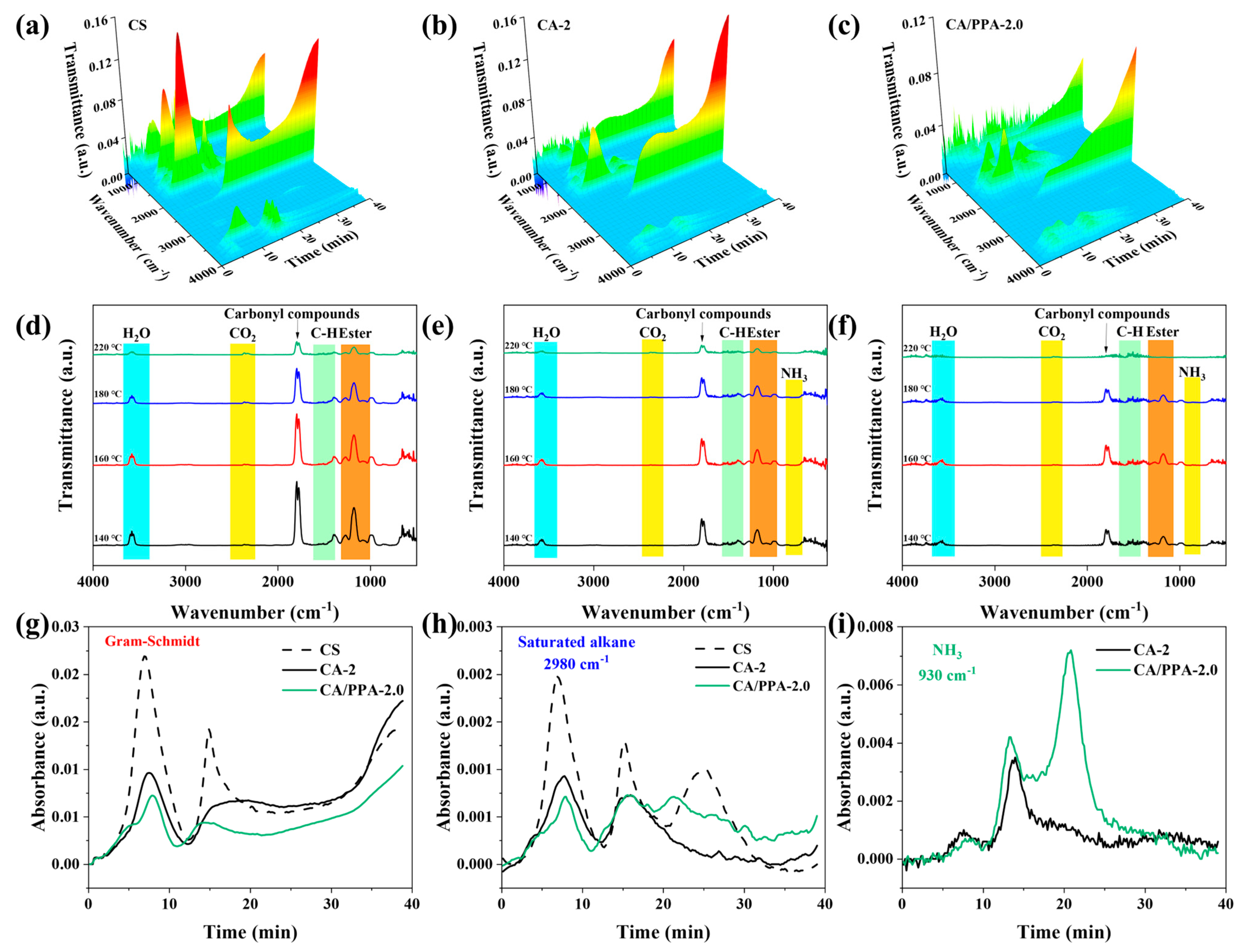 Figure 10. (ac) 3D TG-IR spectrum; FTIR spectra of (d) CS, (e) CA-2, and (f) CA/PPA-2.0 at different temperatures; (g) Gram–Schmidt curves; absorbance of (h) saturated alkanes and (i) NH3.