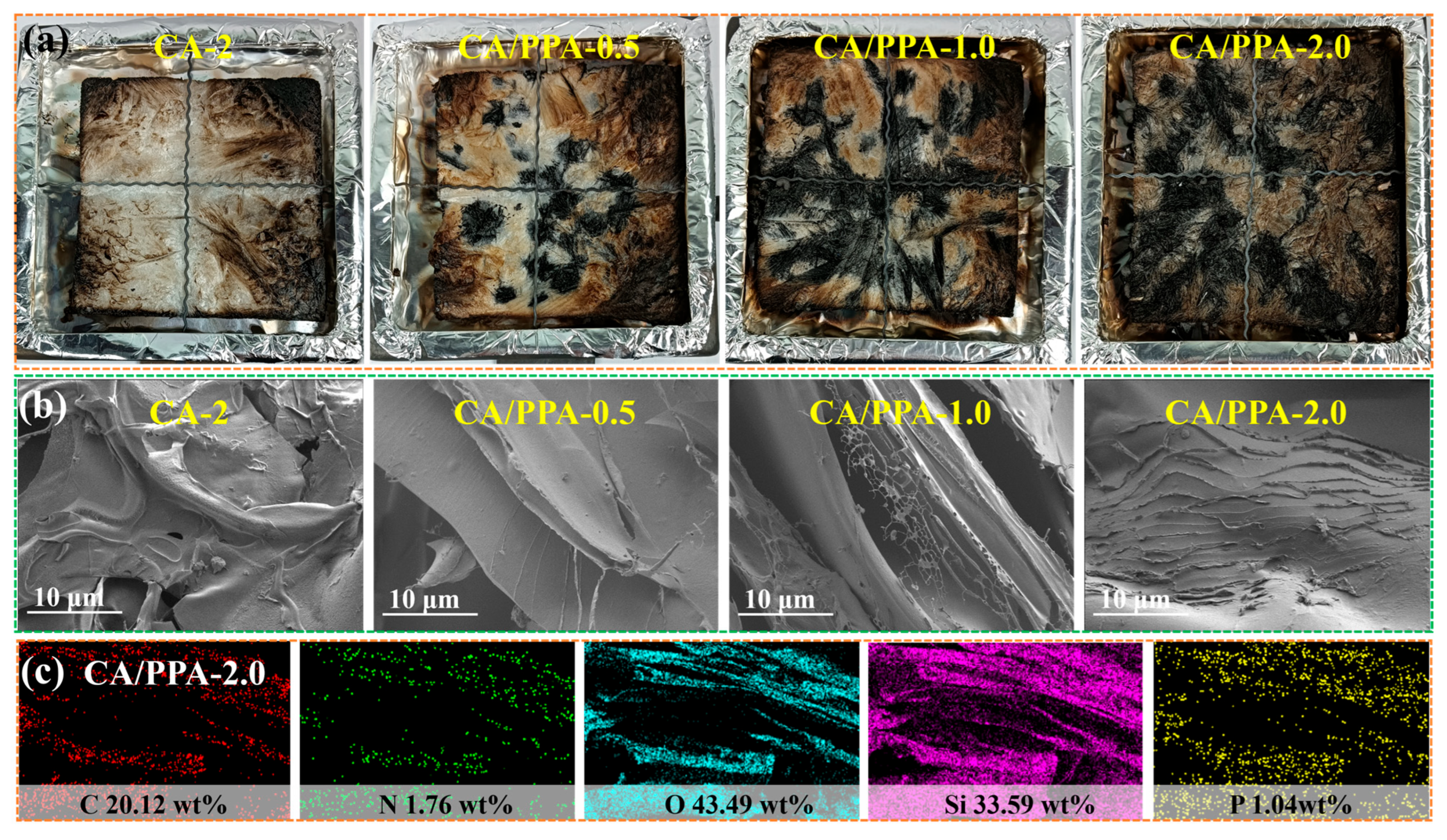 Figure 11. (a) Digital pictures of char residues of aerogels after CONE; (b) SEM image of the CA/PPA char residues; (c) EDS elemental mapping of char residues of CA/PPA-2.0.
