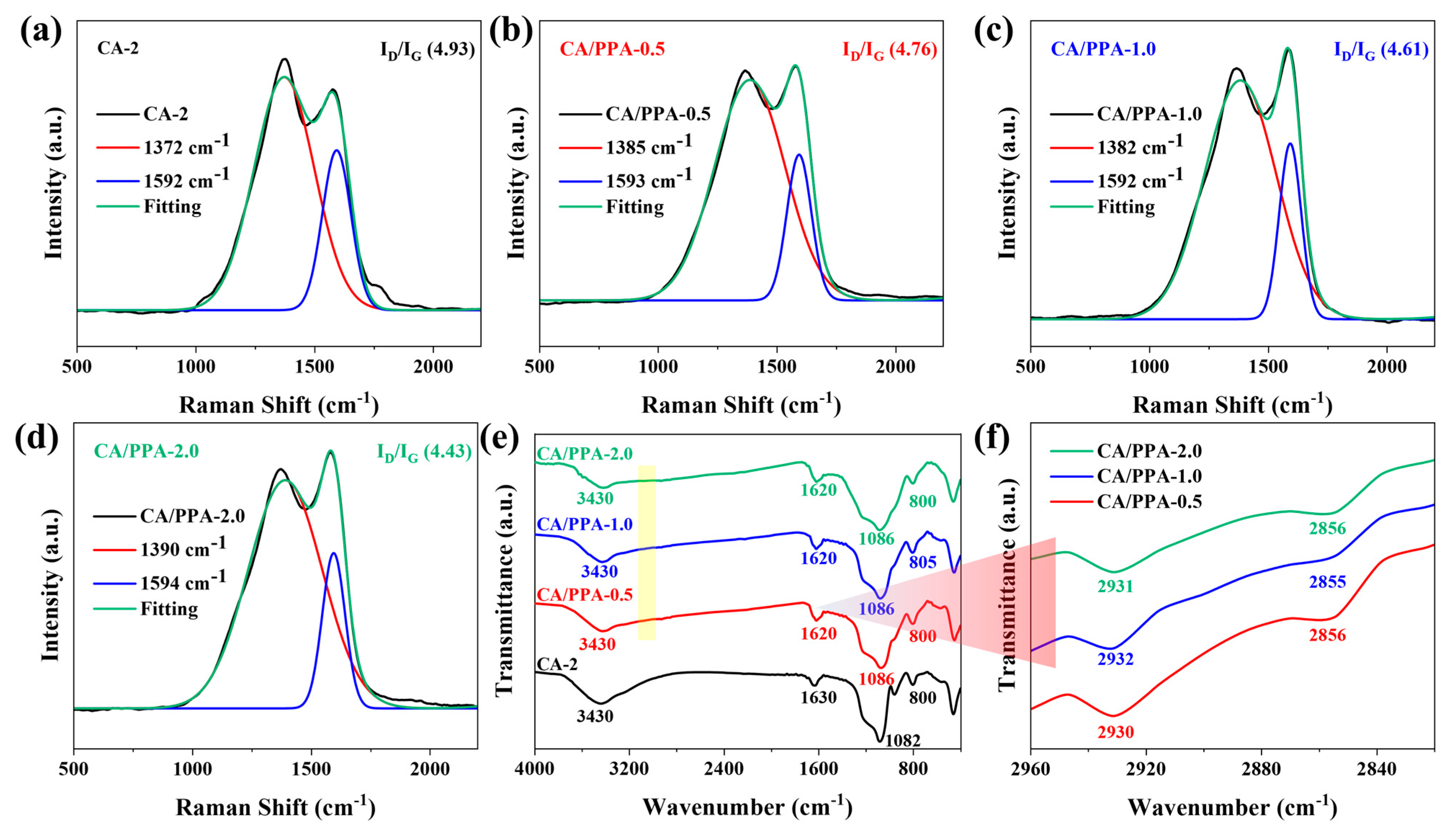 Figure 12. Raman spectrum of char residual of (a) CA-2, (b) CA/PPA-0.5, (c) CA/PPA-1.0, and (d) CA/PPA-2.0; (e,f) FTIR spectra of the char residual.
