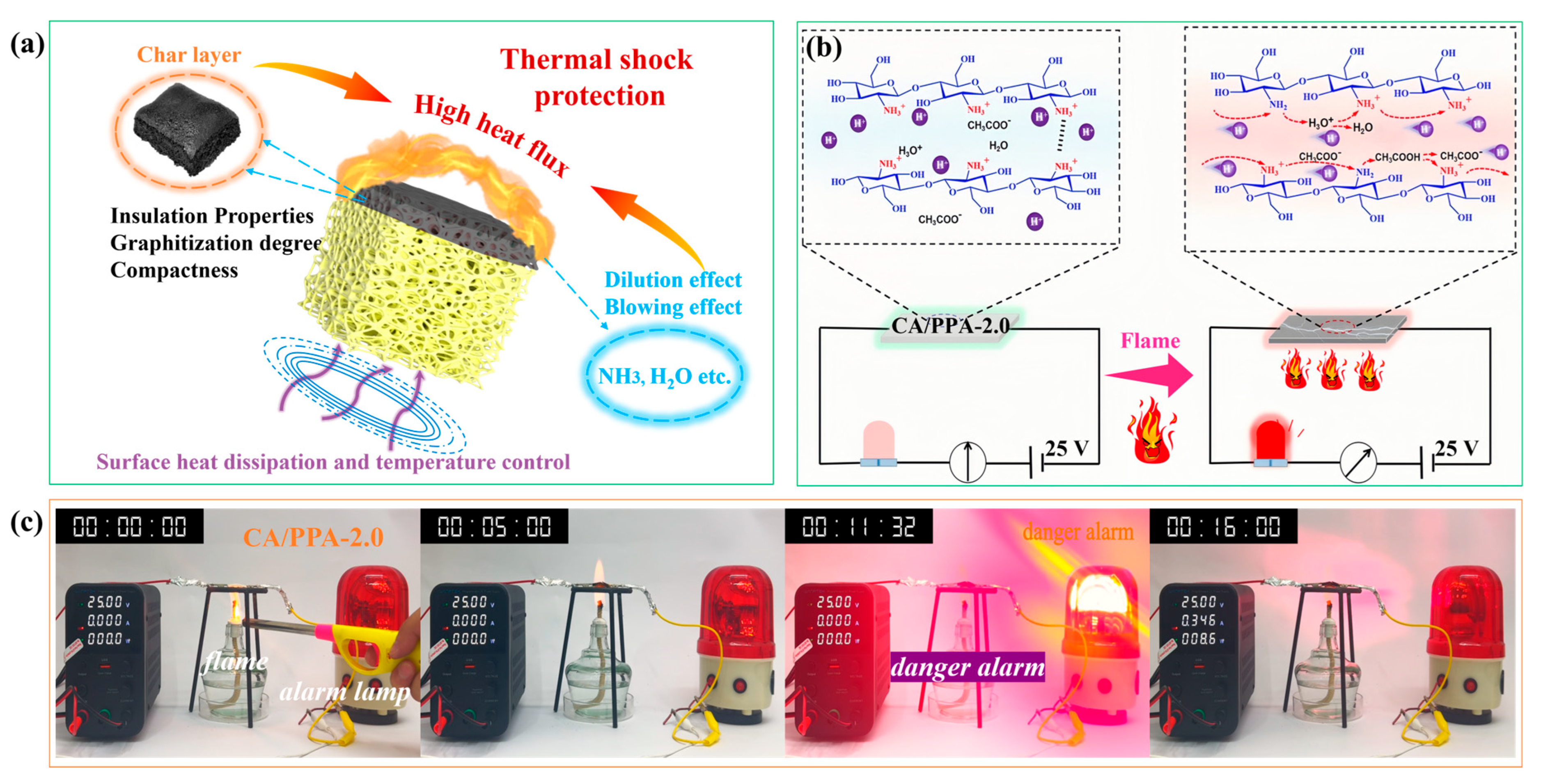 Figure 13. (a) Schematic illustrations of flame retardancy mechanism for CA/PPA composite aerogel; (b) fire-warning mechanism and (c) pictures of flame detection processes of CA/PPA-2.0.