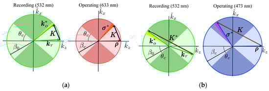 of the grating vector [,]. In detail, for a sinusoidal grating, is given by the wave vectors and , which are, respectively, the reference and the object beam during the recording process, whose modulus is , related to the wavelength of the recording light in air and the refractive index of the recording medium .