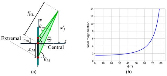 (a) A schematic representation of the propagation angles and extremal rays when considering a holographic lens in air. (b) Focal magnification as a function of the object angle from the comparison between the substrate and air propagation.
