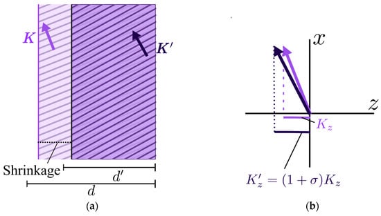 The fringe rotation shrinkage model: (a) a change in the fringe’s structure due to the reduced thickness of the material; (b) a comparison of the grating vectors (resized to a larger scale): the x-vector remains constant, whereas the z-component changes according to the shrinkage value.