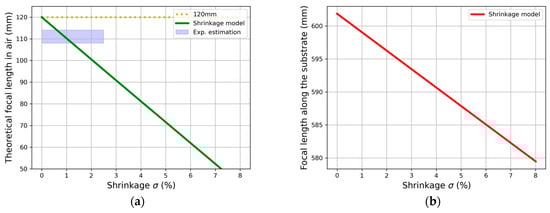 Qualitative estimation of shrinkage model in focal length of transmission HL of 12 cm: (a) using nm and its comparison with experimental values and (b) corresponding focal length along substrate when operating wavelength is used (633 nm).