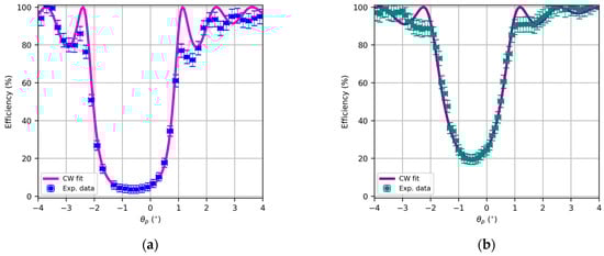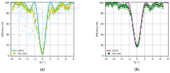 In this sense, it is important to remark that the maximum shrinkage calculated by Covestro for this photopolymer is 1.5%. In this sense, if the angular or spectral response is fitted using coupled wave theory, the first approximation of the refractive index and optical thickness can be performed, which, respectively, are and for Figure 7a and and for Figure 7b.