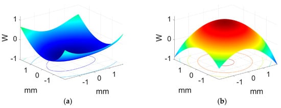 With respect to the lens quality measurements, we follow the steps described in []. The wavefront sensor used in this work was a Hartmann–Shack WFS30-5C model from Thorlabs (Bergkirchen, Germany). This instrument is composed of a 1936 × 1216 pixel CMOS camera with an active area of 11.34 7.13 mm2, an array of microlenses with a pitch of 150 m, and an effective focal length of 4.1 mm. The recorded holographic lenses have a height of 20 mm, which is not symmetrical based on the central and extremal points that can be seen in Figure 3a. Nevertheless, we only worked with a beam with a diameter of 6 mm, due to the limitation imposed by the complementary metal–oxide–semiconductor (CMOS) of the HS wavefront sensor, so our results are subjected to this constraint.