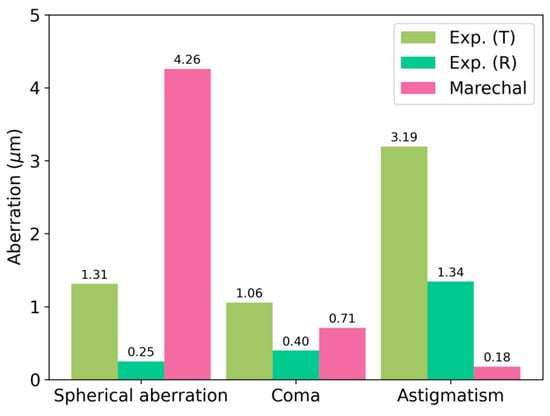 From the wave aberration function, we can compute the Seidel coefficients for the aberration terms that are relevant for our purpose (spherical aberration, coma, and astigmatism) and compare them with the so-called Marechal tolerances [], which depend on the wavelength of the reconstructed beam. The experimental results and their comparison are shown in Figure 12.
