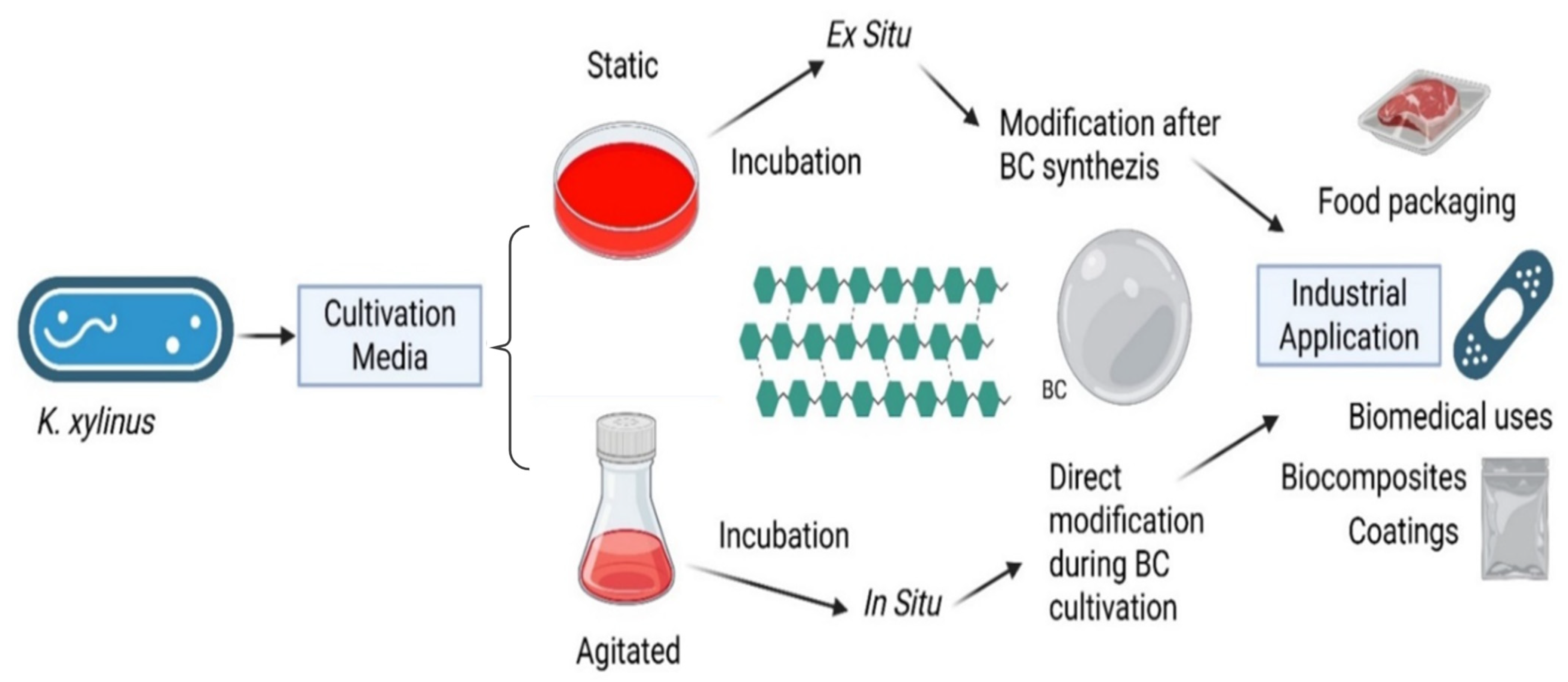 K. xylinus as the most thoroughly documented and extensively employed bacterial species for cellulose production across a range of applications in the fields of food, medicine, and sustainable packaging.