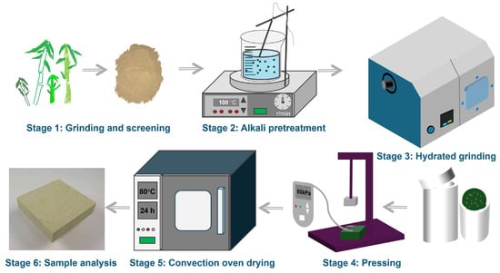 NaOH solution was prepared at a concentration of 0.5 wt.%, 1.0 wt.%, 1.5 wt.%, 2.0 wt.%, and 2.5 wt.%. The blank one was labeled as 0.0 wt.%. A weight of 50 g bamboo powder was added to 1 L NaOH solution in a 2 L flask. It was heated to the boiling point with a stir rate of 600 rpm for one hour. After cooling, it was washed in a polyethylene mesh bag with distilled water until the pH reached neutrality and then dried at 105 °C to remove any remaining water. A weight of 30 g pretreated bamboo powder was mixed with 150 g distilled water at a ratio of 1:5 and placed into a 500 mL zirconia grinding pot (Model 3SP2, Nanda Instrument, Nanjing, China). The hydrothermal grinding time was set for 2 h. The resulting suspension was transferred into a high-pressure reactor (Model 4547, Parr Instrument, Moline, IL, USA) for further refinery. The reaction time was 30 min, and the temperature was 120 °C, with a pressure of 0.6 MPa and a rotating speed of 600 rpm. The refined bamboo fiber suspension was collected and placed in a 7 cm × 7 cm × 5 cm mold. A pressure of 80 kPa was applied to the suspension for 20 min to remove part of the water and form a fixed shape. A fibrous mat was obtained after the removal of the mold. It was further dried in an oven at 80 °C and 105 °C, respectively. During drying, the mat was weighed every hour to monitor the moisture loss. The surface of the dried products was removed for a better observation of fiber morphology. The fabrication procedure is presented in Figure 1.