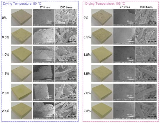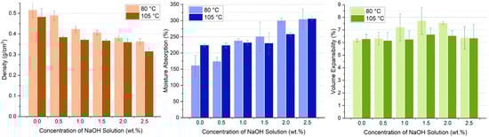 The bamboo-based porous molding material is fabricated without the use of any petrochemical adhesives. The density of molding material was 0.51 g/cm3 at 80 °C and 0.48 g/cm3 at 105 °C, shown in Figure 4. The samples that were dried at 105 °C had a lower density than those dried at 80 °C. After alkali treatment, the density ranged from 0.36 to 0.49 g/cm3 at 80 °C and 0.32–0.38 g/cm3 at 105 °C. As the NaOH concentration increased, the density gradually decreased in a regular trend. At the same temperature, samples with higher NaOH concentrations exhibited lower densities, likely due to the increased porosity and reduced moisture content. The minimum density was achieved at the NaOH concentration of 2.5 wt.%. Lignin was partially removed from the bamboo structure by alkali pretreatment. Bamboo fibers of various sizes were generated by the HTG process. These fibers wrap around each other to form a structure that is similar to a random coil. More open pores were formed due to this structure, which made the density of alkali-treated samples lower than that of the untreated samples. However, under high-temperature treatment, cellulose chains break, causing pores to become blocked and thereby reducing porosity. A reduction in porosity enhances sample strength, with the extent of this effect depending on internal structural characteristics []. Additionally, higher temperatures intensify molecular motion and result in a more compact structure, which explains why the density of samples treated at 105 °C is lower than that of those treated at 80 °C.