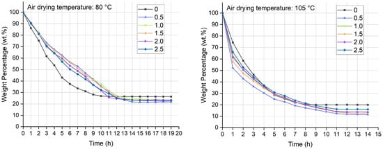 The high-viscosity fibrous suspension produced by the HTG process contained around 83 wt.% water. An amount of ca. 47 wt.% water in the suspension was removed by cold pressing at 80 kPa for 20 min []. The rest of the water was removed by high-temperature oven drying at 80 °C and 105 °C, respectively. The elimination of water required 12 h at 80 °C and 10 h at 105 °C, as shown in Figure 3. This reflects the dynamic changes in heat transfer and moisture migration throughout the drying process. The concentration of NaOH solution had a very slight influence on the drying rate. At both temperatures, the weight loss trends were similar, with a maximum weight loss occurring in the initial stages. At the first hour, the temperature of the drying medium increased rapidly with an increase in the surface of the samples, the moisture in the mat could absorb more energy per unit time []. The suspension is a matrix composed of nano-, micro-, and macro-bamboo fibers. During the drying process, the transfer of moisture within the mat occurs through both capillary action and diffusion. Other than the water removal, the high temperature caused the polymerization of uncondensed lignin and other active components. In this process, water improves the plasticity of the bamboo fibers and gives the final products mechanical strength. For such fully biomass foams, water was even used to weld foams into various designed structures via oven drying [].