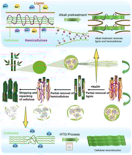 As an efficient bamboo fiber modification technology, alkali treatment fundamentally optimizes the microstructural and macroscopic properties of fibers by precisely removing lignin and hemicellulose from bamboo cell walls in a staged process. In the initial stage of alkali treatment, the NaOH solution triggers the cleavage of ether bonds and carbon-carbon bonds inside lignin molecules. The cellulose microfibrils, originally bound, are gradually released. Subsequently, the residual hemicellulose in bamboo cell walls, surface wax, pectin, and other impurities are effectively removed. The removal of these impurities not only eliminates the physical wrapping of hemicellulose on cellulose but also significantly increases the specific surface area of the fibers with a large number of hydroxyl groups on the surface. A possible detailed mechanism is shown in Figure 6. As active groups, these hydroxyl groups can form stronger chemical bonding and physical adsorption with matrix materials, thereby effectively enhancing the interfacial bonding ability between fibers and the matrix. When bamboo treated with alkali undergoes the HTG process, the fiber and matrix with a gradient structure and heterogeneity undergo more complex structural reorganization.