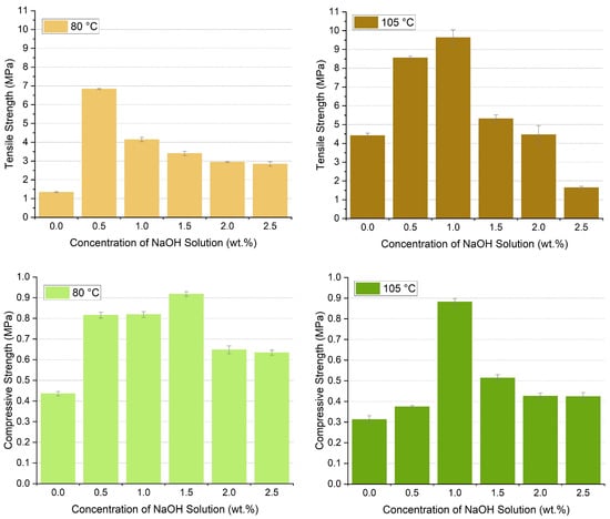 The tensile strength and compressive strength are used to evaluate the mechanical strength of bamboo-based molding materials. The results indicate that alkali pretreatment has a positive effect on improving the mechanical strength of molding materials, as shown in Figure 7. For the tensile strength at 80 °C, it increased from 1.34 MPa to 6.83 MPa with 0.5 wt.% alkali pretreatment but decreased to 2.84 MPa as the NaOH concentration increased to 2.5 wt.%. A similar phenomenon was observed for samples dried at 105 °C, with the highest tensile strength of 9.63 MPa. The tensile strength of bamboo fiber is closely related to alkali treatment conditions: when NaOH concentration exceeds 0.5%, excessive lignin removal and cellulose degradation lead to fiber strength reduction. High-temperature drying (105 °C) might promote water gasification and pore densification. Stronger alkali treatments negatively impacted fiber which was verified by other research []. For the compressive strength, it increased with the NaOH concentration but decreased above the NaOH concentration of 2.0%. The highest compressive strength was obtained with 0.92 MPa with 0.5 wt.% NaOH concentration at 80 °C. Compression strength is regulated by pore structure: 1.0% NaOH concentration balances pore uniformity and fiber reinforcement effects. The differences in tensile and compressive performance originate from distinct dependency mechanisms on fiber integrity and matrix structure.