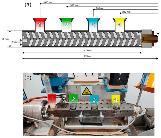 (a) Scheme and (b) digital picture of the twin-screw extruder used in this work.