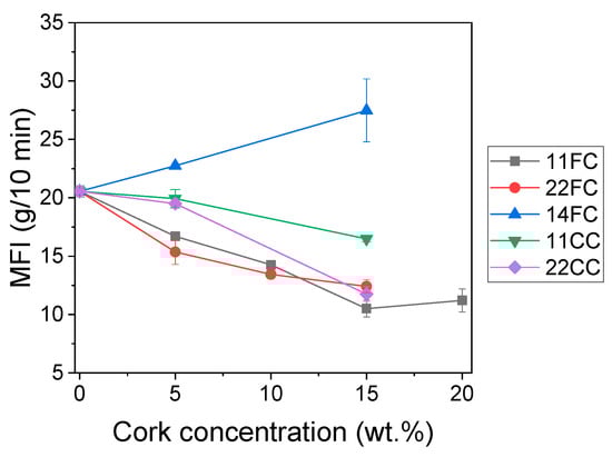 Then, a study of the composites’ flowability was conducted to better understand whether the presence of cork particles impacted melt viscosity, limiting the processability of the material by FGF and affecting the mechanical properties of the printed objects. Figure 2 shows that for both FC and CC composites, the melt flow index (MFI) decreased with increasing cork concentration, regardless of whether it was introduced at inlet 1 or 2 (composites labeled as 11FC, 11CC, 22FC and 22CC). This effect is expected because as the cork content increases, the mobility of the ASA polymer chains is limited, and melt viscosity decreases due to steric hindrance effects. However, in the case of 14_FC composites, the MFI increased above that of ASA, which was unexpected because, as mentioned above, an increase in particles typically decreases melt flowability. We believe this may have been because, by introducing cork at an extruder inlet so close to the outlet, its degradation was minimized during the compounding process. This potentially led to the cork degrading during the MFI measurements, carried out at 225 °C. Under these conditions, the cork degraded inside the equipment, releasing gases that resulted in a lower-than-expected apparent MFI. Since the MFI process was carried out under conditions like those used in FGF printing, it was expected that this gas release would also occur during printing. In any case, all the MFI values obtained are between 10 and 40 g/10 min for all the materials tested, which is considered valid for FGF [], implying that they can all be processed by this technology.