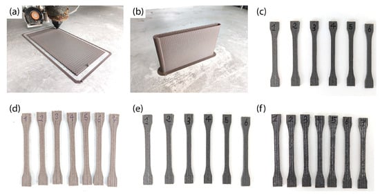 Digital pictures of (a) an XY plate using 11FC_10 and of (b) an XZ plate using 11FC_10, (c) 11FC_15, (d) 14FC_15, (e) 11CC_15, and (f) 22CC_15 tensile testing specimens manufactured by FGF. All the images were taken under the same light and exposure conditions, so they are directly comparable.