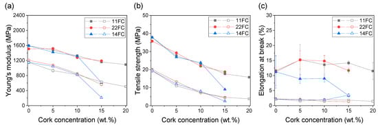 (a) Young’s modulus, (b) tensile strength, and (c) elongation at break values of 11FC (black), 22FC (red) and 14FC (blue) composites as a function of the cork concentration. Filled symbols correspond to XY tensile specimens while hollow symbols correspond to XZ tensile specimens.