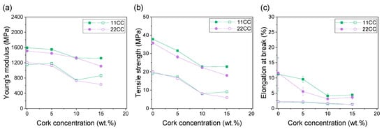 (a) Young’s modulus, (b) tensile strength, and (c) elongation at break values of 11FC (green) and 22FC (purple) composites as a function of the cork concentration. Filled symbols correspond to XY tensile specimens while hollow symbols correspond to XZ tensile specimens.