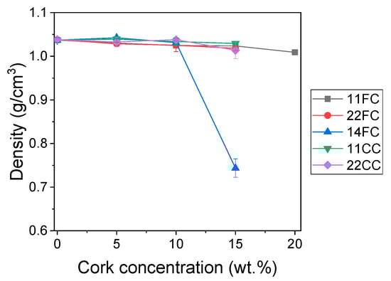 Then, the density of the printed objects was measured (Figure 6) and it was observed that there were no significant differences between the cork composites and ASA (around 1.04 g/cm3) in all cases except for 14FC_15, which had a density of ca. 0.75 g/cm3. This unusual behavior is in agreement with the MFI results, where the higher cork content introduced in inlet 4 prevented degradation during compounding but led to partial degradation during the FGF printing process, likely releasing gases that could become trapped in the composite structure, resulting in a lower apparent density. For the remaining composites, the density values are higher than expected, since cork has a nominal density of 0.2 g/cm3. However, the values observed in these composites are slightly below the value provided by the ASA supplier (1.11 g/cm3). This small decrease is probably due to the gaps generated between strands and layers deposited during the FGF process itself, according to previous reports [,], not due to the cork. Hence, the influence of the cork particles on the density of the composite was not observed, probably because they were crushed during the extrusion process, as previously observed [,]. This would have made the cork lose its characteristic cellular structure, which is what makes cork a lightweight material. Other studies show that it is important to further minimize the impact of extrusion by modifying the cork particles on the surface or using alternative methods such as solvent casting to obtain lightweight cork composites [,].