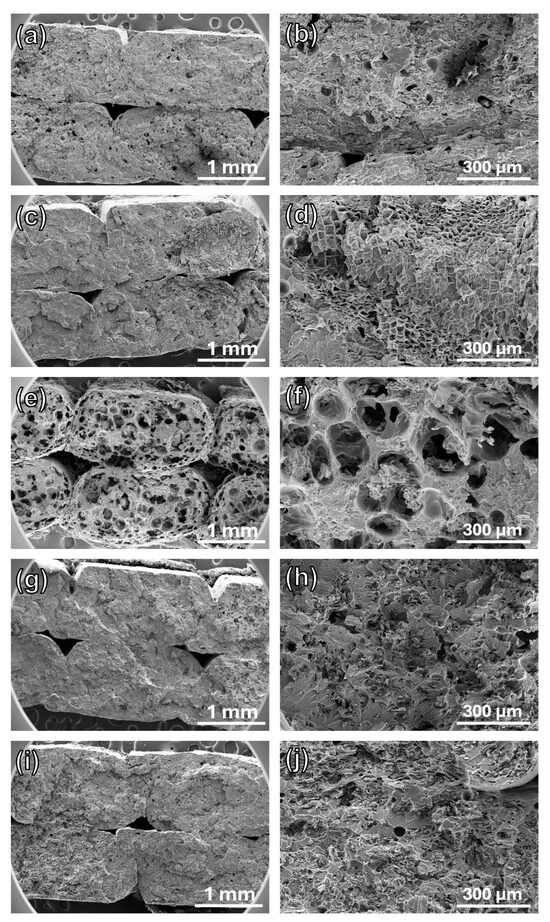 To corroborate these results, the fracture surfaces of the XY specimens of composites 11FC_15, 11CC_15, 14FC_15, 14FC_5, and 14FC_10 were analyzed using SEM. Figure 7 shows flat fracture, characteristic of brittle fracture, for all cases. This means that the cork participated in the fracture mechanism, embrittling the ASA matrix, as also observed for the mechanical properties, as the elongation at break values decreased with the presence of either FC or CC. The SEM images evidence the presence of the cork’s cellular structure, although this structure mostly collapsed in almost all cases, which explains why the objects printed using FGF had a density practically identical to that of pure ASA. In the case of 11CC_15, Figure 7d shows that the internal part of the cork particle can keep its cellular structure. It seems that these particles, being larger, preferentially collapse at their outer part, allowing their internal structure to remain unaltered. In other words, larger particle sizes potentially result in cork composites without their structure collapsing. However, as previously observed, this does not represent a significant improvement in mechanical or physical properties, so further research is needed. However, the fracture surface of 14FC_15 (Figure 7e,f) showed a highly porous surface, with pores much larger than those characteristic of cork cells, in the order of hundreds of microns. The presence of uncrushed cork particles, which kept their cellular structure, can also be observed within these large pores. This supports our previous hypothesis that cork particles release gases during their partial degradation under the influence of printing via FGF, resulting in a foam-like porous structure, which simultaneously protects the cork particles from collapse. Interestingly, this effect was only clearly visible in 14FC_15, when the concentration of cork particles was higher. SEM images of 14FC_5 and 14FC_10 (Figure 7g–j) show certain roughness and porosity outcomes, which may have been due to the smaller amount of gas released as a result of the cork’s degradation. However, it seems that in these composites, the amount of cork did not reach a critical threshold for the formation of gas bubbles that would have given rise to a porous structure such as that observed in 14FC_15.