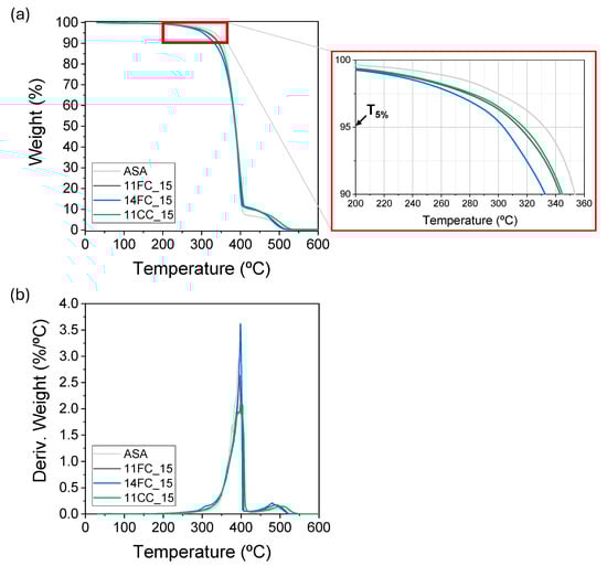 The thermal properties of the composites with 15 wt.% cork previously observed via SEM were analyzed. Figure 8 shows the thermal degradation curves obtained using TGA, from which we can see how, in all cases, the thermal stability of the composites decreased slightly with respect to that of pure ASA. In particular, the degradation temperatures of these materials, calculated as the temperature at which their initial mass decreased by 5% (T5%), are 332, 314, 316 and 302 °C for ASA, 11FC_15, 11CC_15 and 14FC_15, respectively. This also demonstrates that the cork composites prepared with 14FC also had lower thermal resistance, probably because, in this case, the cork had not yet been completely degraded (i.e., carbonized) in the manufacturing process, making it less thermally stable [,]. In the cases of 11FC and 11CC, the cork had already been previously degraded and transformed (at least partially), which would have contributed to greater thermal stability than that of undegraded cork. The maximum degradation speed, observed in the DTG curve, however, shows minimal differences, with values between 393 and 398 °C for all cases, evidencing that the cork mostly impacted the beginning of the degradation of the material.