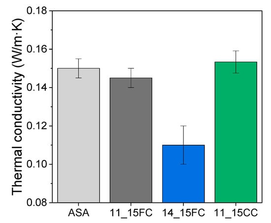 Finally, the thermal conductivity of ASA, 11FC_15, 11CC_15, and 14FC_15 was also measured to study the influence of cork as a thermal insulator in these composites (Figure 9). 11FC_15 and 11CC_15 did not present statistically significant differences with respect to pure ASA. Although it has been previously observed that some cork particles can keep their cellular structure after printing (particularly in the case of 11CC_15), the voids generated during FGF between layers must be considered, as these also contribute to a decrease in the thermal conductivity of the material in general. Therefore, it seems that in these cases, the contribution of the cork particles was not large enough to observe an improvement in the thermal insulation of these composites. 14FC_15, however, showed a decrease of more than 25% in thermal conductivity, mainly due to the generation of large pores by the FC particles during the FGF process. This, as previously observed in the SEM images in Figure 7, allowed for the printing of a rigid foam-like polymer structure with enhanced thermal properties as an insulator, while presenting acceptable mechanical properties compared to other cork composites [,]. It should be noted that this composite could only be manufactured with CF, so in this case, particle size has proven to be a critical element in the design of the feedstock material.