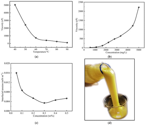 Key properties of the chemical flooding system. (a) Viscosity-temperature curve of crude oil. (b) Polymer viscosity-concentration curve (T = 78 °C). (c) The influence of concentration of surfactant to oil/water interfacial tension (T = 78 °C). (d) Gel morphology after 2 days of aging.