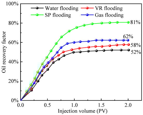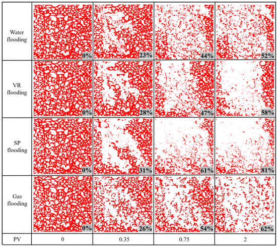 Figure 5 illustrates the morphological distribution of residual oil with respect to injected pore volume for four different displacement media. Red areas represent residual oil, and white areas correspond to the rock matrix and the swept regions. The extent of oil recovery is primarily governed by the sweep efficiency and displacement efficiency of the injected fluids. Comparison of sweep efficiencies reveals significant differences among the systems, ranked as SP flooding, associated gas flooding, water flooding, and VR flooding; these differences are mainly controlled by the combined effects of mobility control and interfacial behavior. SP flooding optimizes the mobility ratio by markedly increasing the viscosity of the displacing phase via the polymer, while the surfactant facilitates ultralow interfacial tension and emulsion transport. Their synergistic effect ensures the most extensive macroscopic and microscopic sweep. Although associated gas flooding improves oil mobility via viscosity reduction and oil swelling, its low intrinsic viscosity makes it susceptible to gas channeling and gravity override, thus limiting sweep efficiency. Water flooding shows low sweep efficiency, owing to a highly unfavorable mobility ratio with heavy oil, resulting in pronounced viscous fingering.