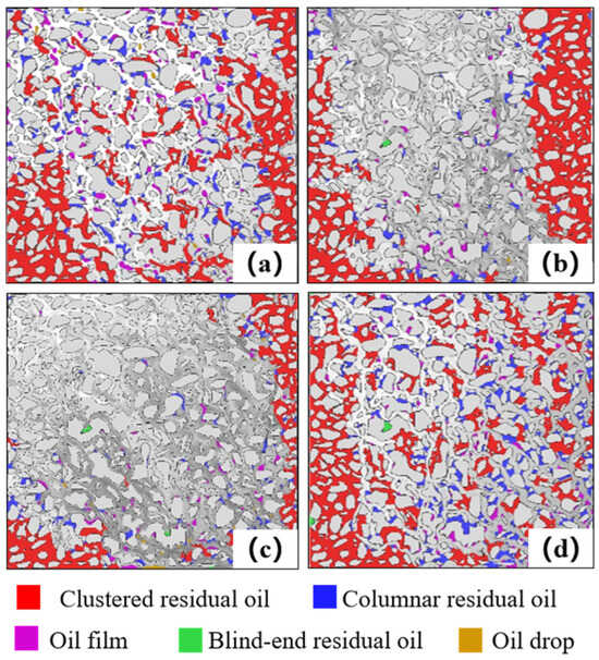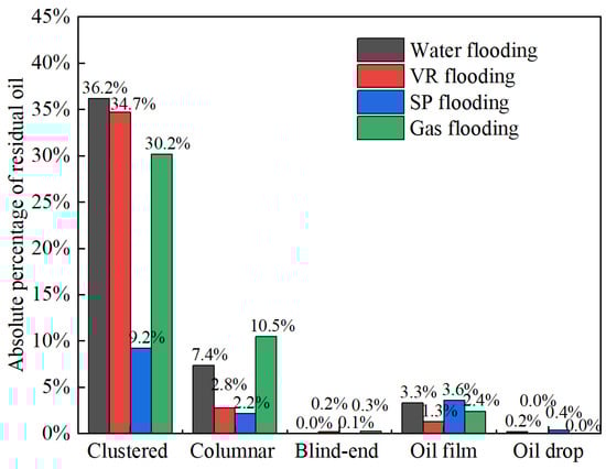 Residual oil within the micro-pore-throat network was identified and classified using a process that combined MATLAB-based image processing with subsequent morphological analysis and manual verification. The oil phase was first segmented from the background by applying a pixel intensity threshold. The classified oil blobs were then analyzed based on morphological characteristics (e.g., shape, size) and their spatial relationship with the pore structure to assign them to predefined types (clustered, columnar, etc.), following established visual criteria. While the high image contrast ensured robust identification of dominant morphologies, we acknowledge that classifying complex or transitional shapes involves a degree of subjectivity. To ensure consistency, the final classification was performed by a single experienced researcher, and its occurrence state was determined according to its morphology and contact with pores and grains. Residual oil was categorized into five types: clustered residual oil, columnar residual oil, oil films, Blind-end residual oil, and oil drop. Clustered residual oil refers to isolated oil globules surrounded by water in multiple pores, whereas columnar residual oil refers to oil columns in relatively large pore-throats, trapped between two or more water segments. Figure 6 shows the residual oil identification results after displacement by four different flooding media. To quantitatively compare oil mobilization by each medium, the absolute proportion of each residual oil type relative to the total saturated oil was calculated, as shown in Figure 7. The proportion of clustered residual oil increases in the following order: SP flooding (9%), associated gas flooding (30%), VR flooding (35%), and water flooding (36%). A smaller proportion of clustered residual oil indicates higher sweep efficiency, suggesting that the SP system achieves the most extensive sweep. Columnar residual oil reflects the ability of the displacement medium to reduce oil-water interfacial tension. The SP system performs comparably to the VR, whereas associated gas flooding shows the weakest reduction, with columnar residual oil accounting for 10%. The proportion of oil-film residual oil indicates the ability of the displacement system to detach oil adhered to pore surfaces. The SP and VR systems exhibit stronger detachment, followed by associated gas flooding, and finally water flooding.