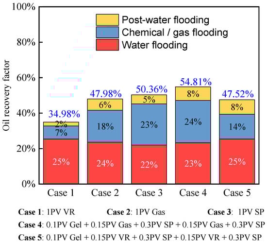 Figure 10 presents the production characteristic curves for multi-medium composite flooding following water flooding. The design of the composite slugs in Cases 4 and 5 follows a strategic sequence to maximize synergistic effects. The initial gel plugging (0.1 PV) diverts subsequent fluids into unswept zones. The following alternating slugs of gas/VR and SP are designed to work in concert: the gas/VR slug penetrates into these newly opened zones, reducing oil viscosity and improving mobility to create an oil bank. The subsequent SP slug then effectively displaces this mobilized bank and scrubs residual oil due to its high viscosity and ultralow interfacial tension. This split-slug, multi-cycle approach enhances both macroscopic sweep and microscopic displacement efficiency more effectively than a single, large slug injection. The flow diversion was quantitatively evidenced by the system’s pressure and production response. As shown in Figure 10, gel injection caused a sharp pressure rise from 0.5 MPa to 8 MPa, confirming effective plugging. This was immediately followed by a significant increase in oil recovery, providing direct evidence that the diverted fluid mobilized additional oil from unswept zones. Subsequently, alternating injections of associated gas and the SP system were carried out. By leveraging the superior sweep diffusion and viscosity-reducing properties of associated gas, together with the mobility control and emulsion-assisted oil transport capabilities of the SP system, two rounds of injection maximized the mobilization of previously unswept oil. In high-water-cut, conventional heavy oil reservoirs, gel plugging followed by associated gas-assisted SP flooding provides substantial economic benefits and favorable recovery performance. The key lies in gel blocking dominant channels, with the synergistic action of associated gas and the SP system forming a more efficient three-dimensional composite displacement strategy, effectively suppressing gas channeling and viscous fingering.