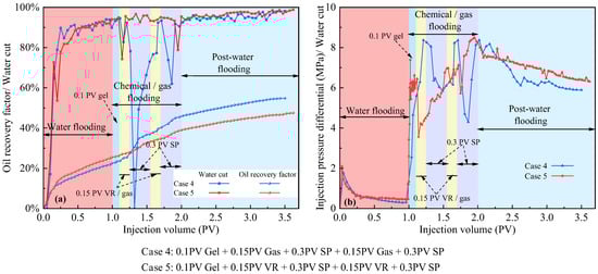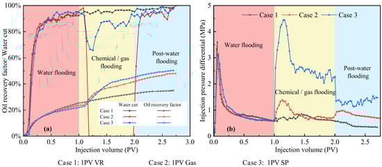 Comparison of core flooding results using multiple displacement fluid slugs. (a) Oil recovery and water cut as functions of injected pore volume; (b) Injection pressure difference as a function of injected pore volume.