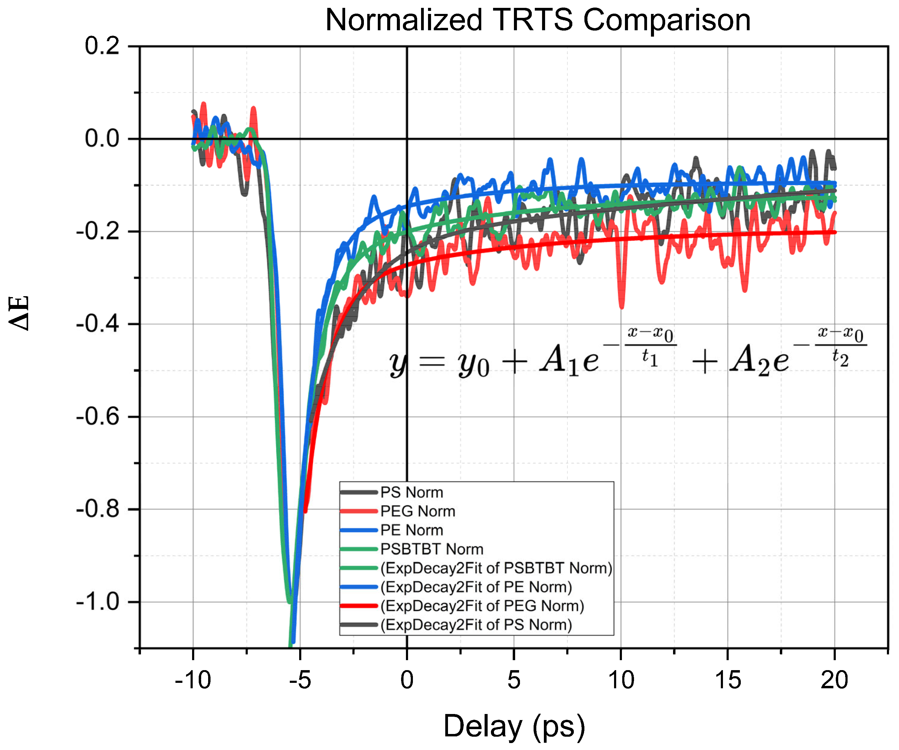 Figure 3 shows the overlapping “peak” normalized TRTS responses for the four film samples; in the figure, a contrast in the matrix-dependent conductivity may be observed in both the initially generated polaron and the longer-delay time non-zero signal “tail” from photoconductive free-carriers. By normalizing the time-dependent TRTS scans to their “peak” maximum signal amplitude, variations in sample optical density (OD) fluctuations in pump pulse power are removed, along with reflective losses from the films. Thus, the relative change in TRTS “tail” signal amplitudes (e.g., y