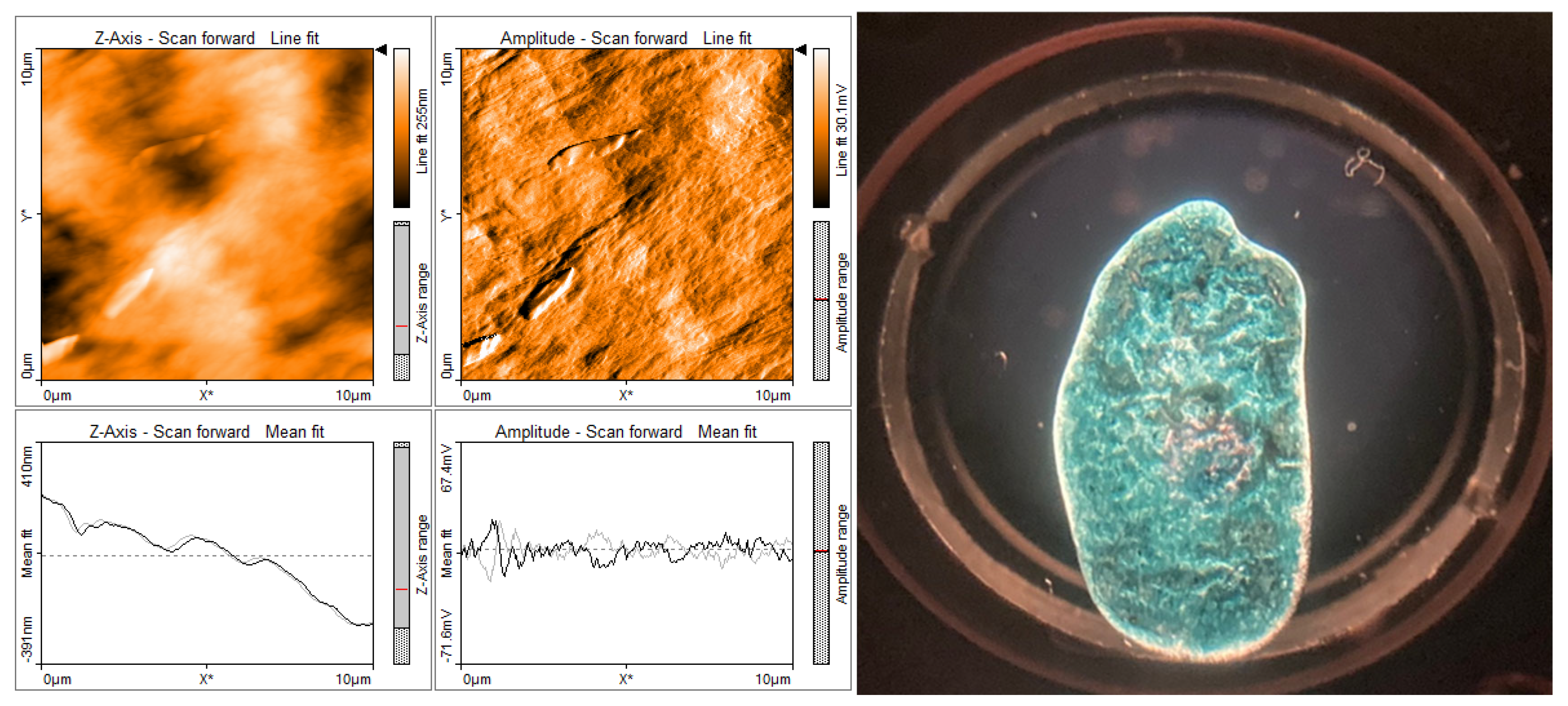 Contact atomic force microscopy (Nanosurf Easyscan 2 *) Nanosurf AG Liestal Switzerland was used to map the surface topography for possible inhomogeneous structures in the deposited polymer films. Potential PSBTBT structural alignment was investigated using these measurements. The resulting 10 × 10 micron AFM contact topography images for the three polymer matrices may be found in