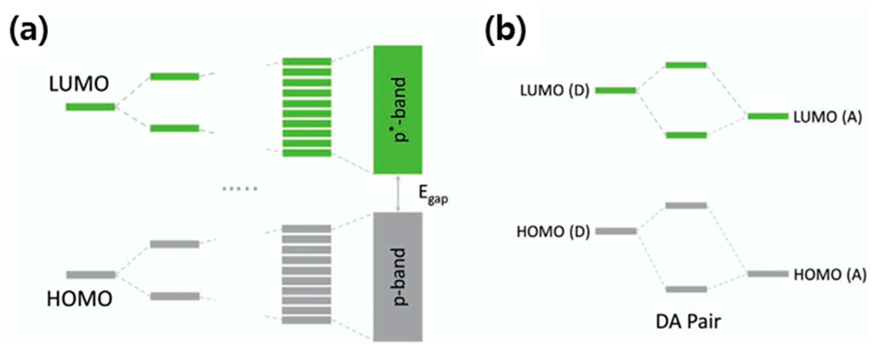 Figure 1 illustrates the electronic structures and energy level interactions in conjugated polymer systems. In Figure 1a, the formation of delocalized electronic bands in conjugated polymers is shown, where the discrete molecular orbitals—HOMO (highest occupied molecular orbital) and LUMO (lowest unoccupied molecular orbital)—broaden into continuous π and π* bands, respectively, as individual molecular units couple through conjugation. The energy difference between these bands defines the Eg, which governs the optical and electronic properties of the polymer semiconductor. Panel (b) depicts the energy level alignment in a donor–acceptor (D–A) pair system, where the HOMO and LUMO levels of the donor and acceptor interact to create new hybridized frontier orbitals. This donor–acceptor interaction leads to intramolecular charge transfer and bandgap tuning, which are key strategies for optimizing charge separation and electronic performance in polymeric semiconductors.