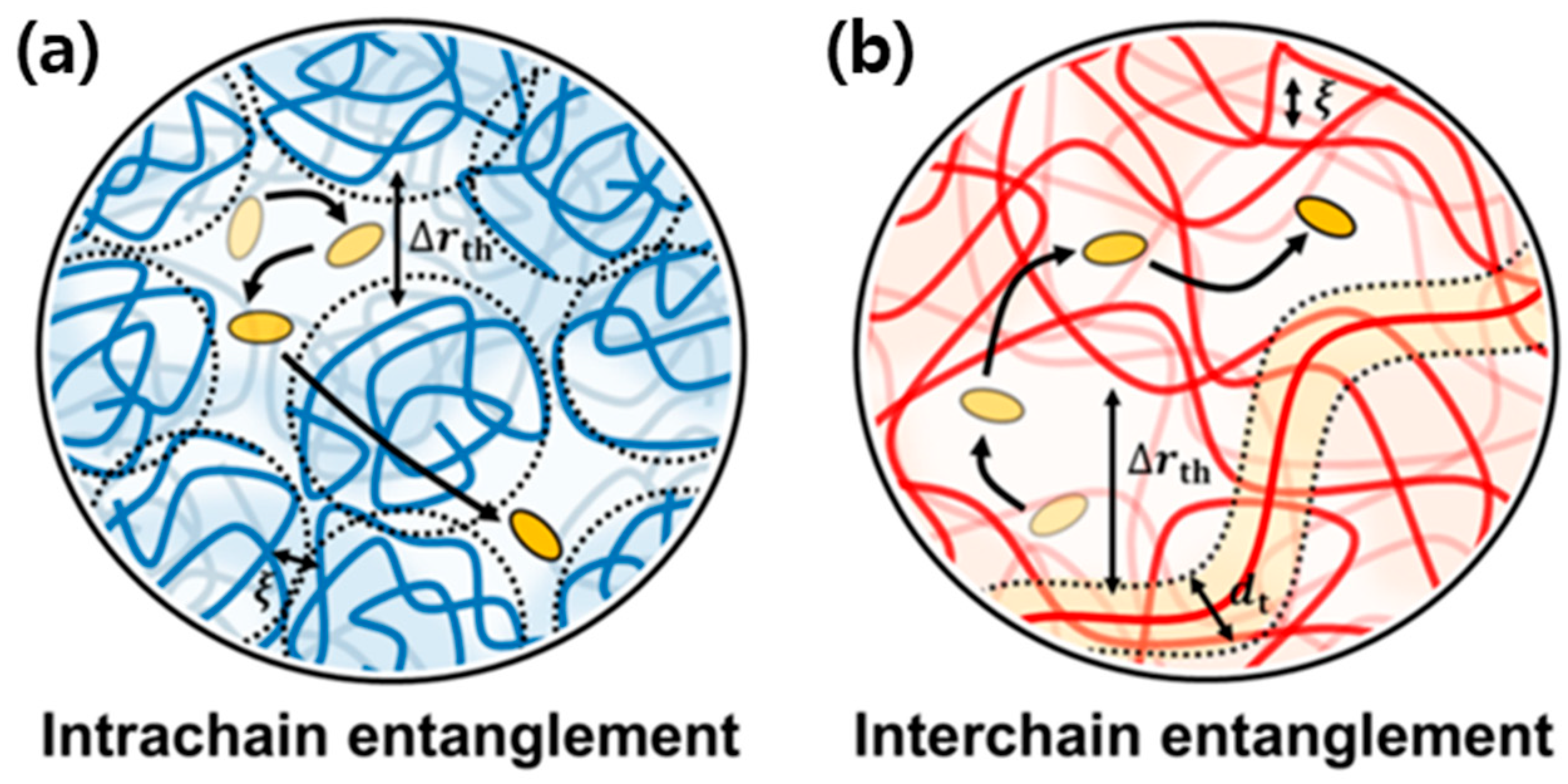 Figure 2. Schematic of (a) intrachain and (b) interchain entangled polymer networks. Blue and red strands represent individual polymer chains in the intrachain and interchain entanglement regimes, respectively. The dotted lines outline the corresponding confining regions within each network. Arrows indicate the direction of probe motion, and Δr denotes the two-dimensional displacement between consecutive probe positions extracted from single-molecule trajectories. Here, dt, and ξ denote the tube diameter and correlation length, respectively. Reprinted figure with permission from ref. [26]. Copyright (2025) American Chemical Society.