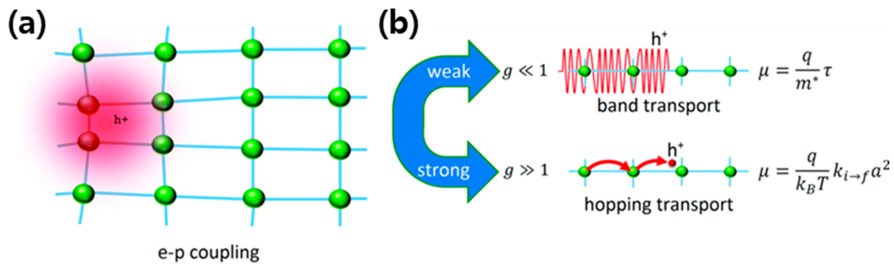 Figure 3. (a) Schematic illustration of polaron formation induced by electron–phonon (e–p) coupling, highlighting how increasing coupling strength localizes the charge carrier (h+) and transitions the system from a delocalized band-like regime to a localized hopping regime. (b) Comparison of the weak (g ≪ 1) and strong (g ≫ 1) coupling limits. The curved arrow indicates the transition between regimes, and the red shading highlights carrier localization. The asterisk (*) denotes the effective mass. Reprinted figure with permission from ref. [31]. Copyright (2017) The Royal Society of Chemistry.