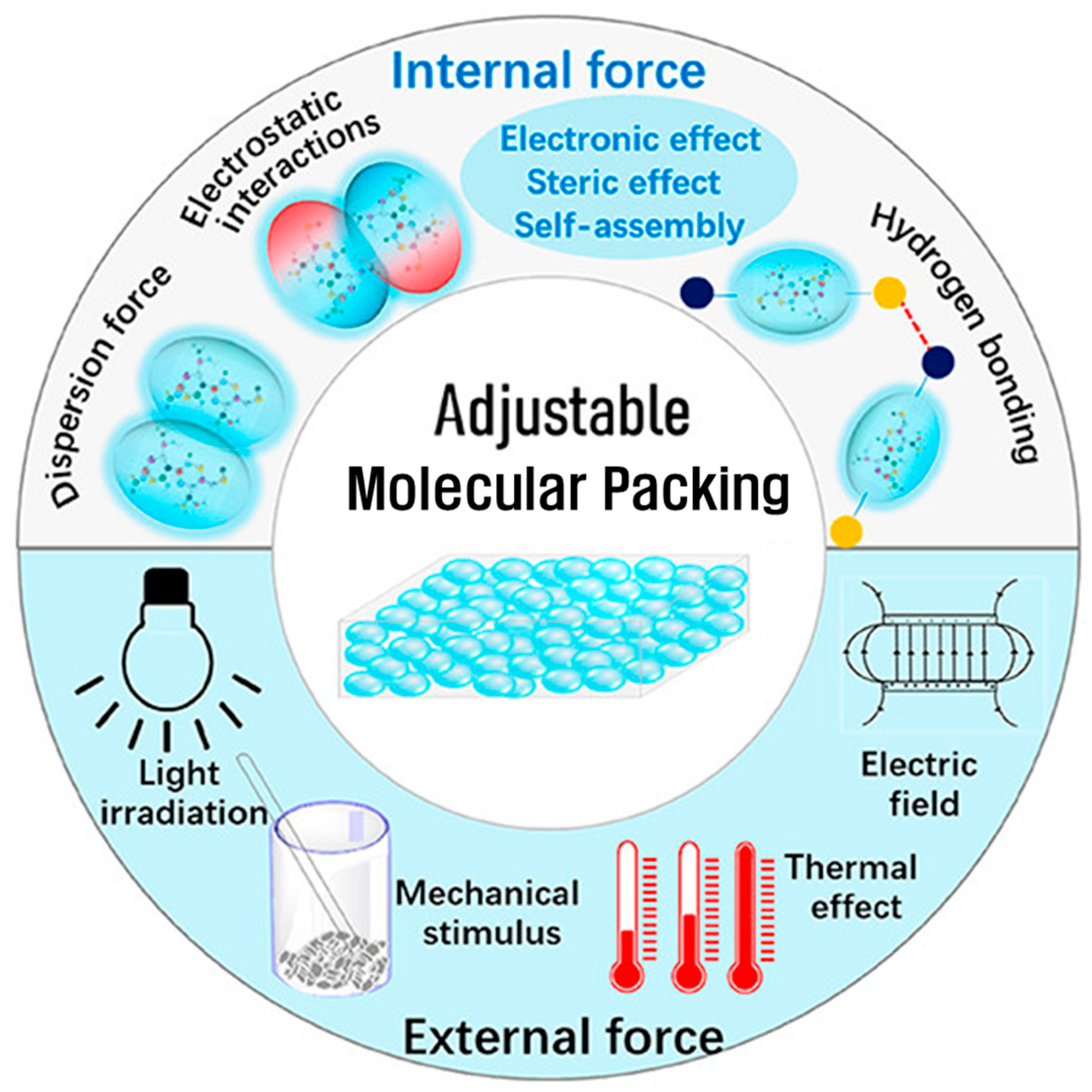 Figure 4. Schematic illustration of adjustable molecular packing in organic semiconductors. Molecular packing and microstructure critically govern charge transport by controlling orbital overlap and energetic disorder. Internal forces (e.g., dispersion, electrostatic, hydrogen bonding, and steric/electronic effects) and external stimuli (light, heat, mechanical, and electric fields) collaboratively tune molecular organization, thereby modulating electronic performance. Reprinted figure with permission from ref. [36] Copyright (2020) American Chemical Society.