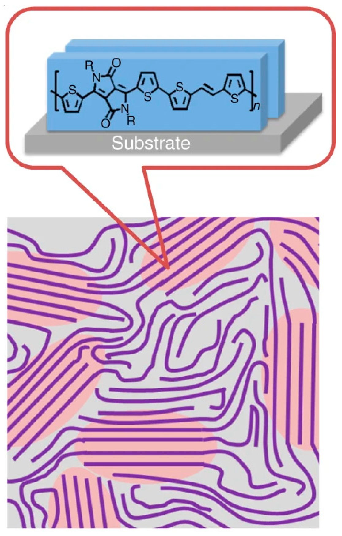 Figure 5. Schematic representation of a polymer thin film containing coexisting crystalline (purple) and amorphous (pink-shaded) regions. The crystalline domains consist of well-ordered lamellar structures with polymer chains adopting an edge-on orientation on the substrate, while the surrounding pink amorphous regions depict the disordered molecular arrangements. Reprinted figure with permission from ref. [39]. Copyright (2019) Springer Nature.