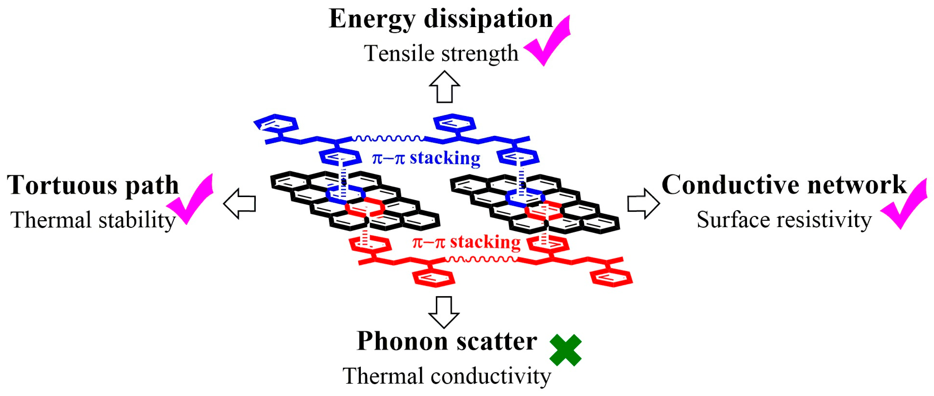 Figure 6. Schematic illustration of π–π stacking interactions and their multifunctional impacts on material properties. π–π stacking between conjugated backbones facilitates charge transport by forming conductive networks that lower surface resistivity, while tortuous pathways improve thermal stability. This figure is adapted from ref. [40] (reproduced under terms of the CC-BY license).