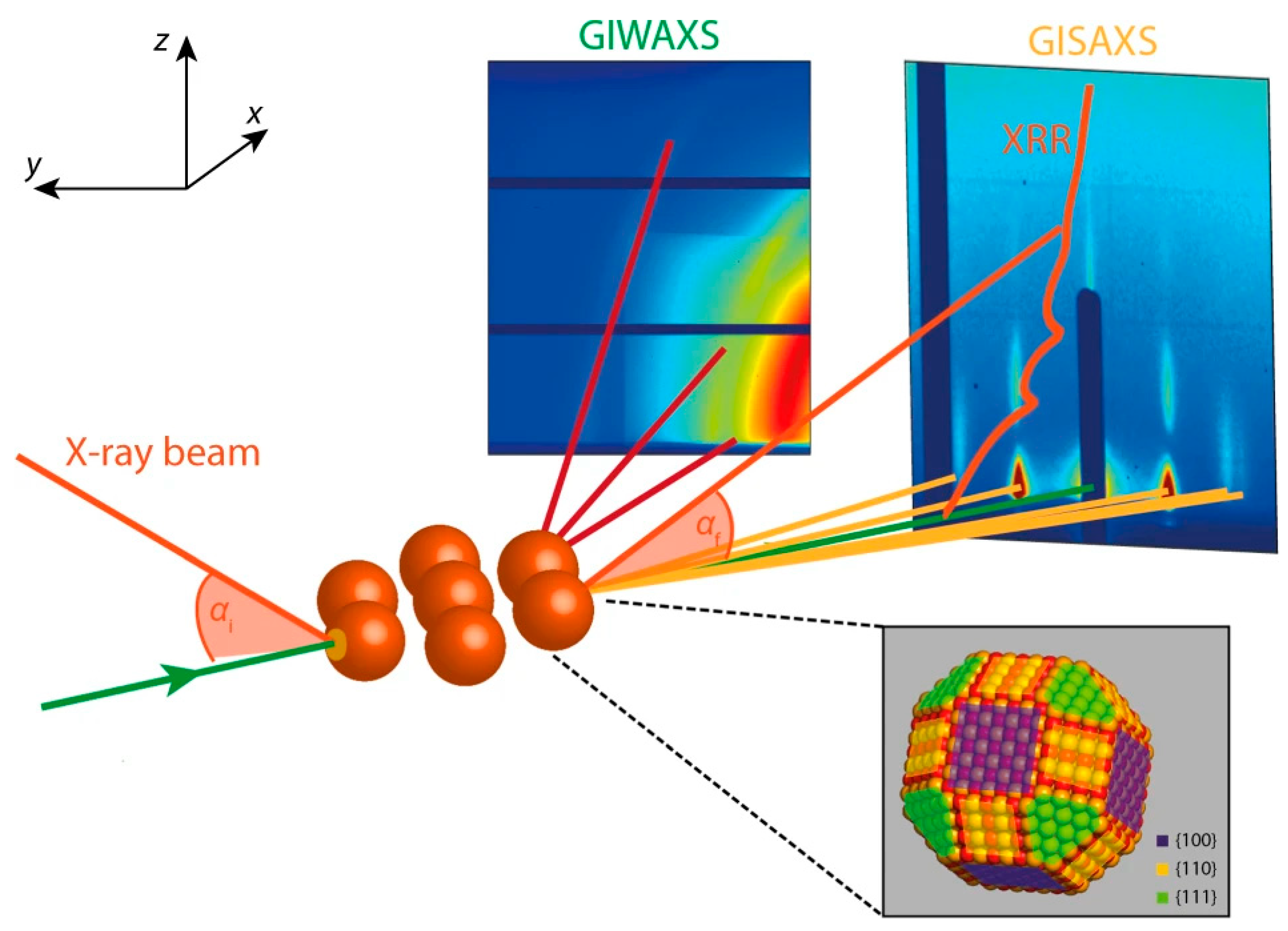 Figure 7. Schematic explaining the concept of the GISAXS/GIWAXS setup. Measurements are taken at a fixed incident angle relative to the liquid surface. GISAXS and GIWAXS signals are collected by detectors positioned in the forward and higher-angle directions, respectively. The inset shows a model of a nanocrystal with different facets labeled as {100}, {110}, and {111}, corresponding to diffraction features observed in the scattering patterns. The red curve in GISAXS indicates X-ray reflectivity (XRR), while the colored scattering maps depict typical intensity distributions in GIWAXS (green) and GISAXS (orange). Reprinted figure with permission from ref. [43]. Copyright (2020) Springer Nature.