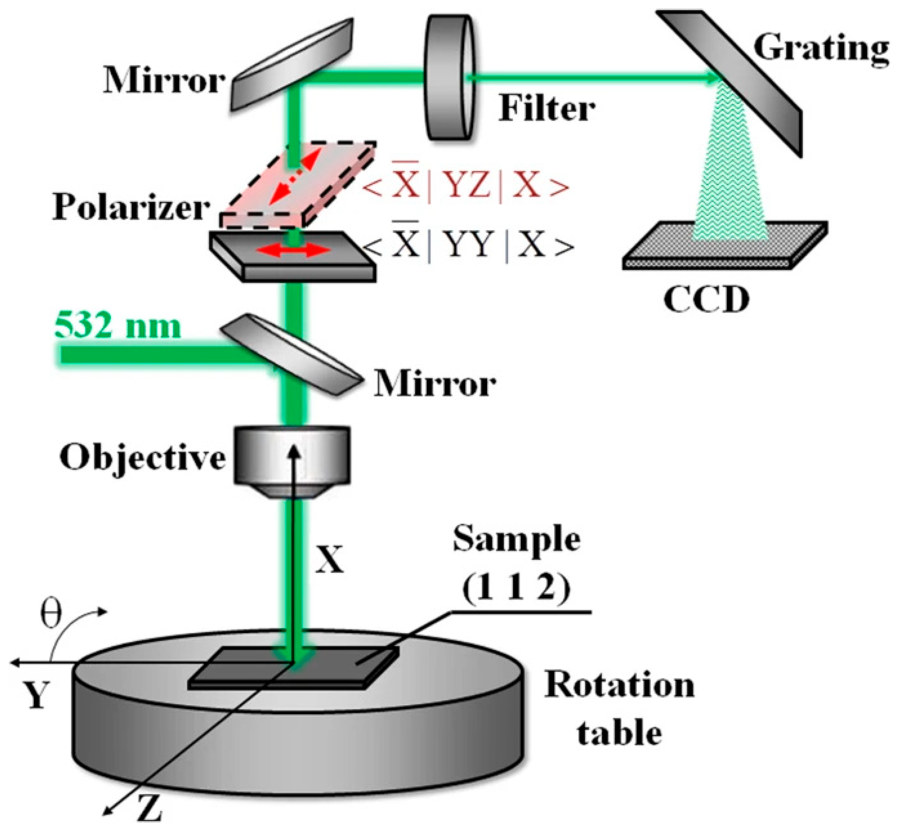 Figure 8. A schematic illustration depicting the detailed experimental setup employed for the polarized Raman spectroscopy measurements carried out on the (112) crystallographic plane, highlighting the orientation of the sample, polarization directions of the incident and scattered light, and the overall optical geometry used during the experiments. This figure is adapted from ref. [49] (reproduced under terms of the CC-BY license).