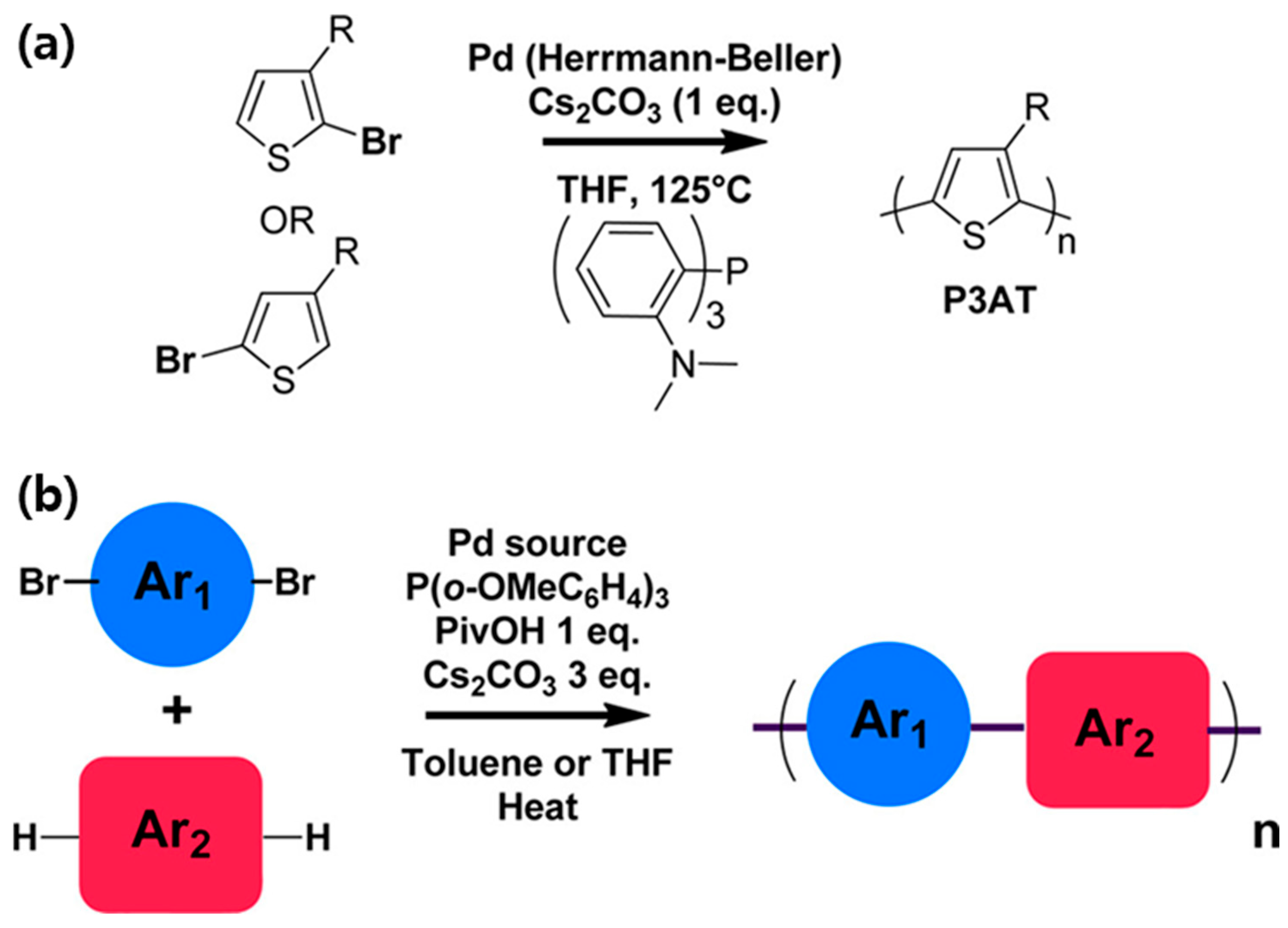 Figure 9. General polymerization strategies for aromatic monomers: (a) homopolymerization of alkyl-substituted thiophenes to P3ATs, and (b) cross-coupling of bromoarenes (Ar1) with heterocycles (Ar2) to produce diverse conjugated copolymers, enabling well-defined polymers with properties comparable or superior to traditional methods. Reprinted figure with permission from ref. [51]. Copyright (2016) American Chemical Society.
