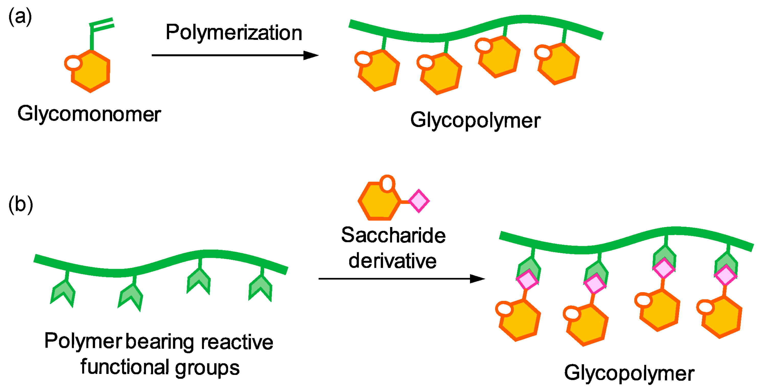 Figure 10. Synthetic routes for glycopolymers via (a) direct polymerization of glycomonomers and (b) post-polymerization modification of pre-formed polymers. This figure is adapted from ref. [52] (reproduced under terms of the CC-BY license).