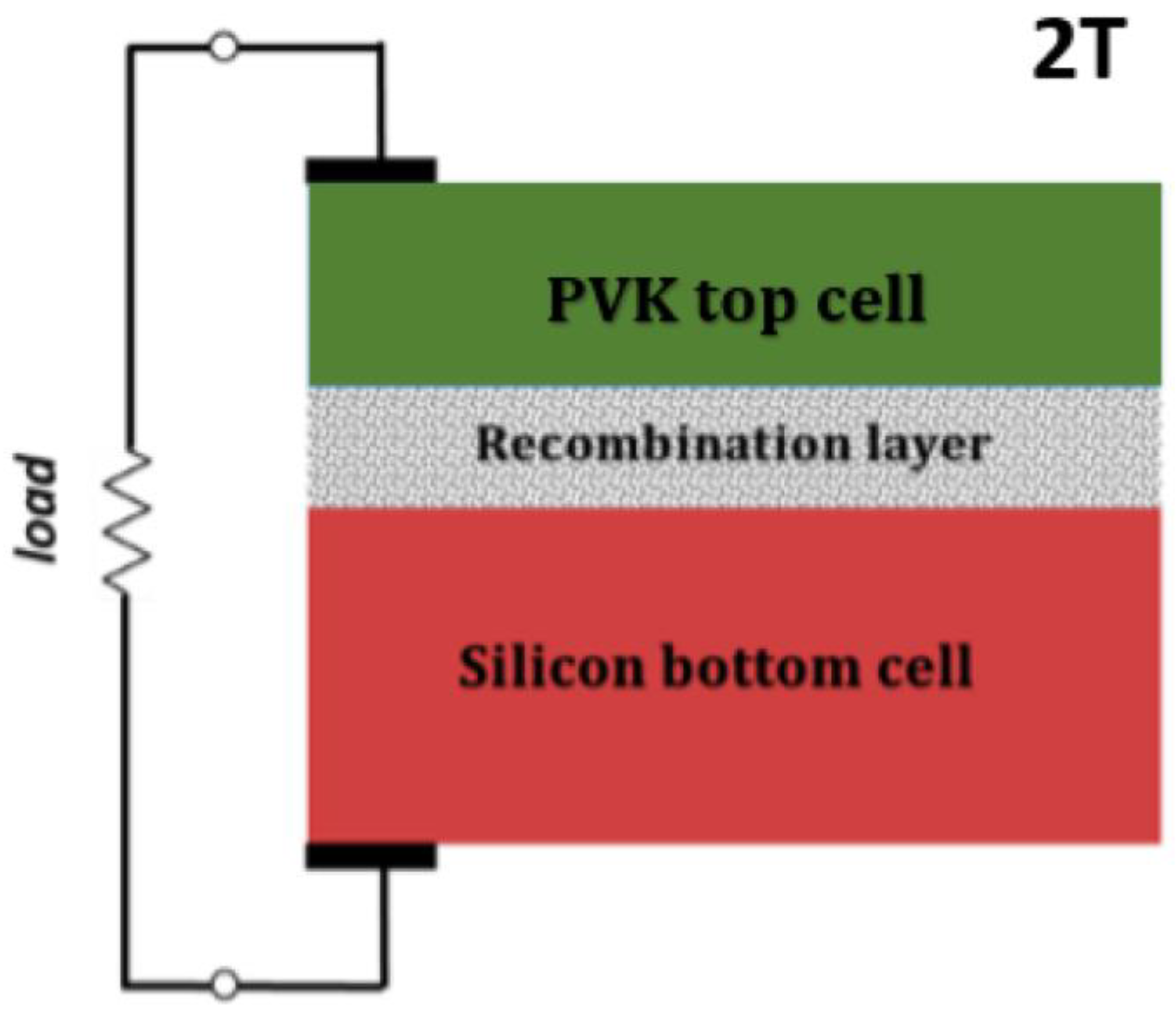 Figure 13. Architecture of a two-terminal tandem photovoltaic cell. Architecture of a two-terminal tandem cell. The front and rear sub-cells are composed of perovskite (PVK, wide-bandgap) and silicon (narrow-bandgap) materials, respectively. Front and rear cells are connected via a recombination layer and selective contacts, with bottom electrode and a top electrode for charge collection. This figure is adapted from ref. [58] (reproduced under terms of the CC-BY license).