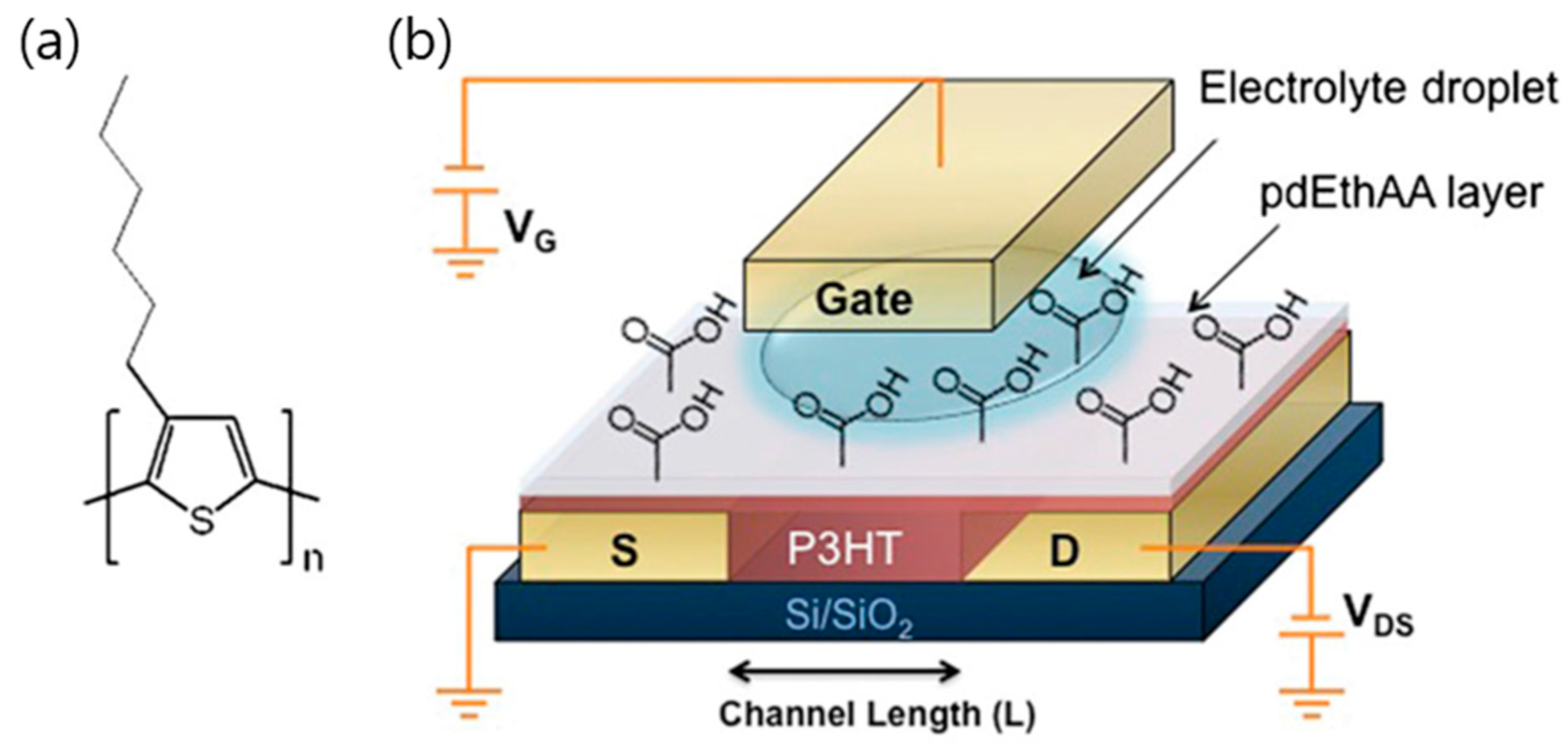 Figure 14. Schematic illustration of an organic field-effect transistor. (a) Chemical structure of P3HT, employed as the organic semiconductor. (b) Illustration of an electrolyte-gated organic field-effect transistor, where a plasma deposited ethylene/acrylic acid (pdEthAA) film produced via PECVD is coated on the P3HT layer. This figure is adapted from ref. [69] (reproduced under terms of the CC-BY license).
