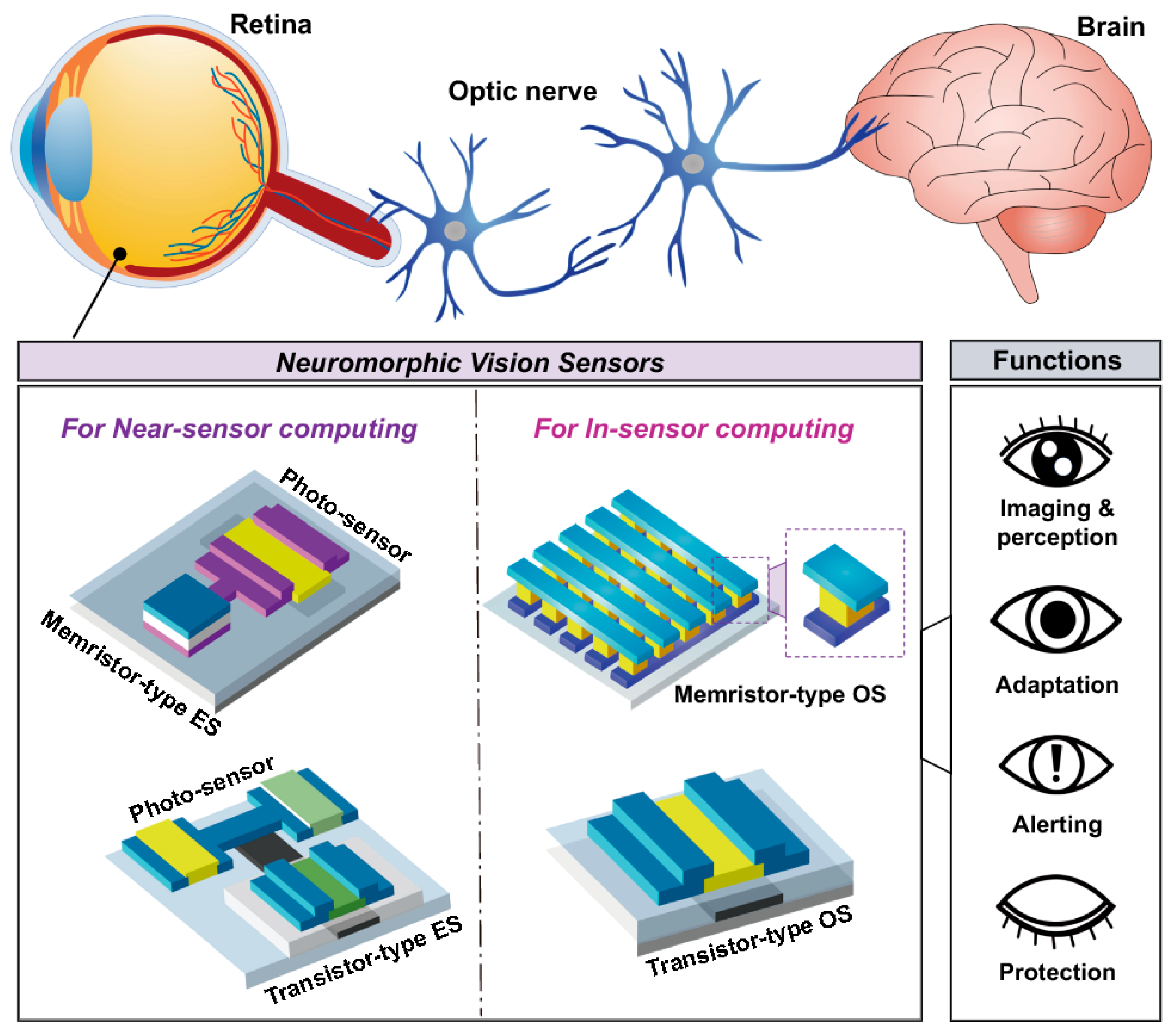Figure 15. Neuromorphic vision sensors inspired by biological systems, including optoelectronic synaptic circuits (OSCs) that function in a near-sensor computing configuration, and optoelectronic synapses (OSs) that operate within an in-sensor computing framework. Reprinted figure with permission from ref. [80]. Copyright (2022) Springer Nature.