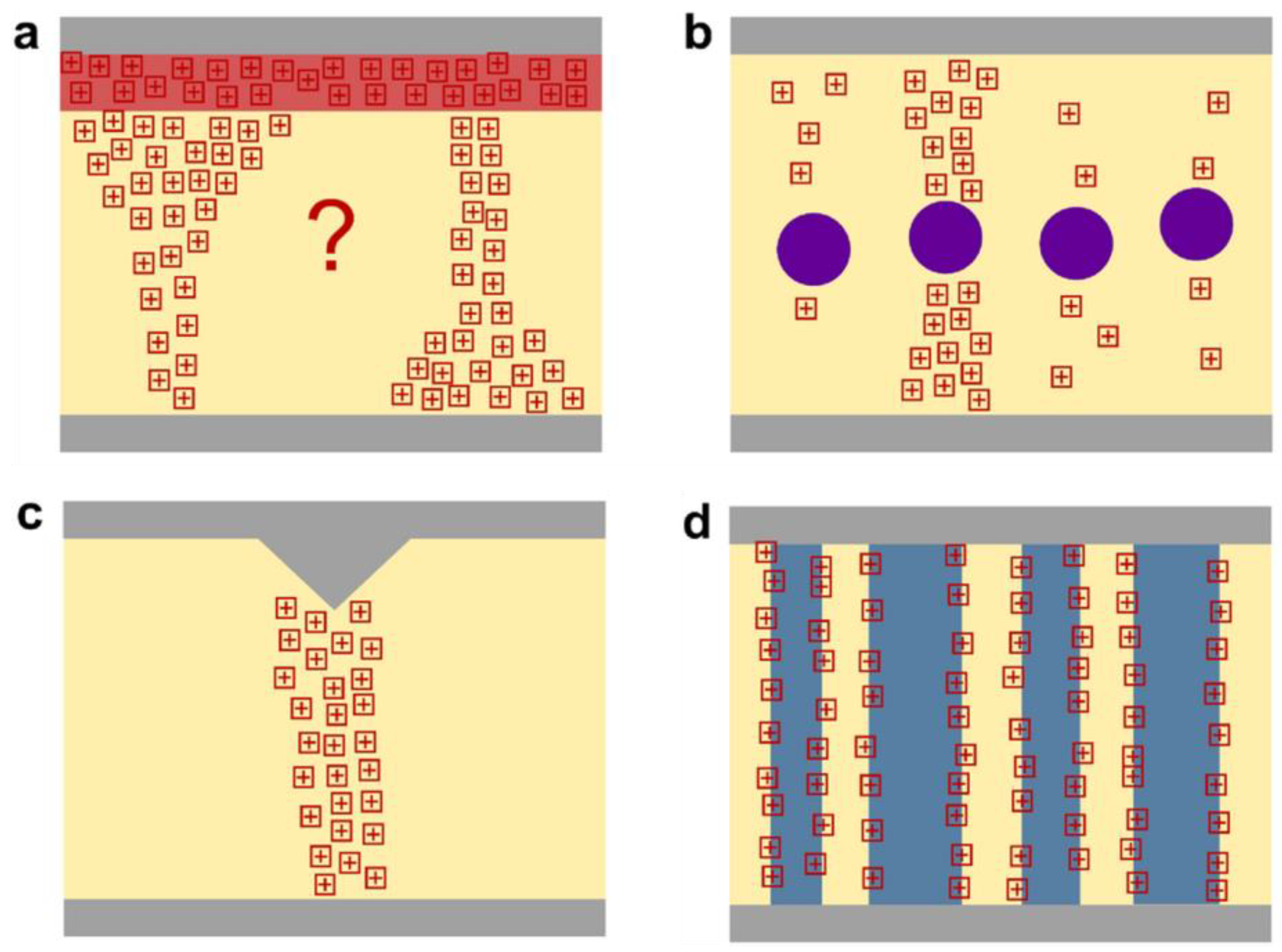 Figure 16. Schematics of representative approaches to explain or control resistive switching mechanisms. Gray regions indicate electrodes, the pale-yellow area denotes the switching layer, and plussed squares represent oxygen vacancies. (a) Formation of an oxygen-vacancy-rich region (e.g., TiOx) enhances switching. (b) Embedded Pt nanoparticles locally strengthen the electric field to guide filament growth. (c) Nanoindentations in the top electrode concentrate the field for controlled filament formation. (d) Vertically aligned HfOx–CeOx nanocomposite films direct filaments along grain boundaries. This figure is adapted from ref. [82] (reproduced under terms of the CC-BY license).