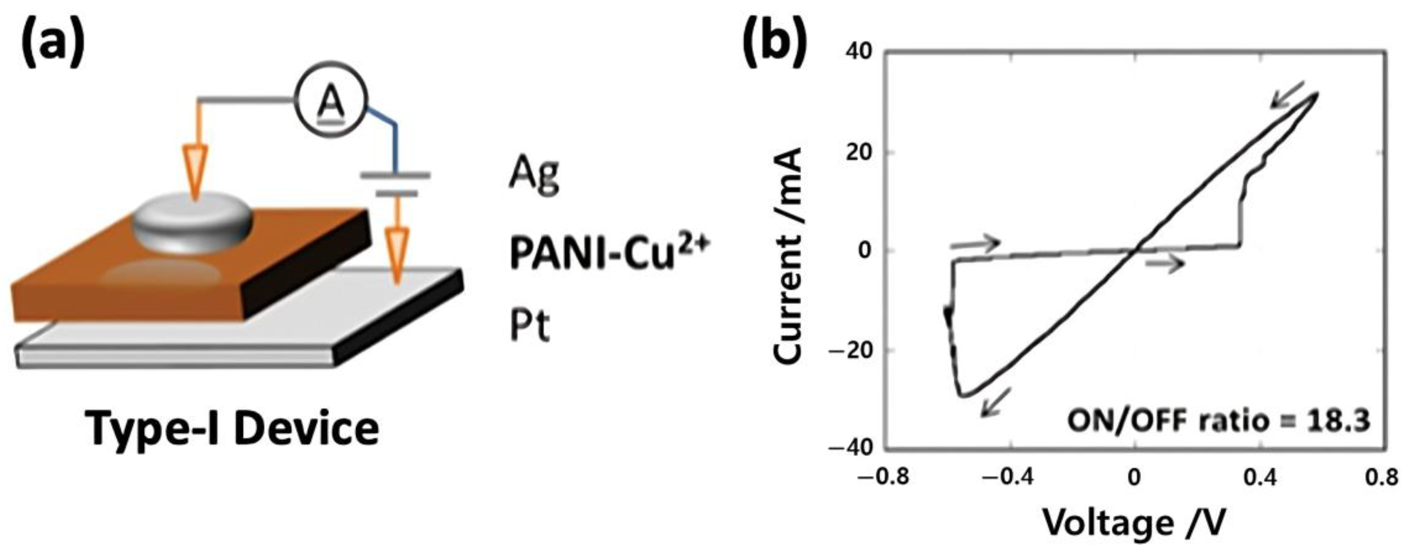 Figure 17. (a) Ag/PANI-Cu2+/Pt switching device architecture, showing switching between high conductance (ON) and low conductance (OFF) states. (b) I–V response of the device measured at a 1 Hz sweep rate. This figure is adapted from ref. [86] (reproduced under terms of the CC-BY license).