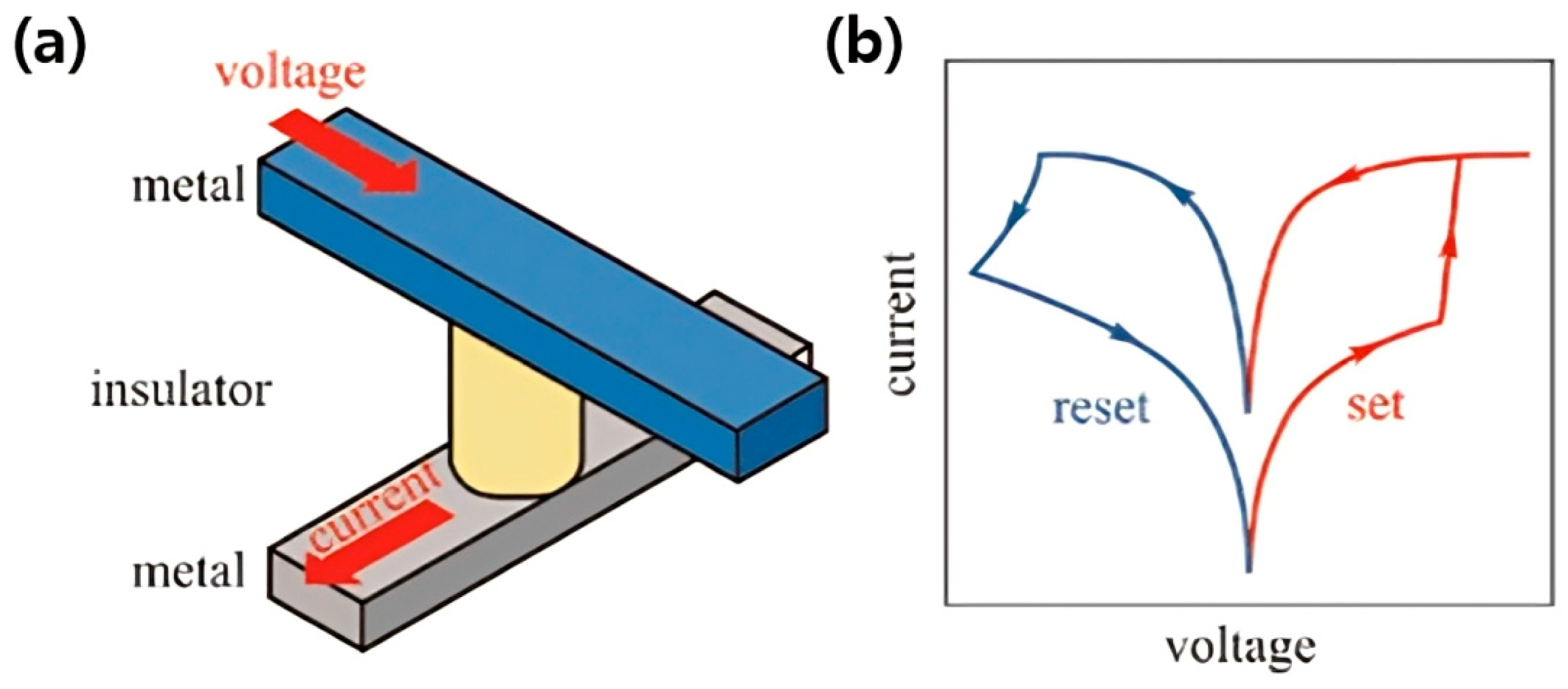 Figure 18. (a) Schematic of a memristor featuring a metal/insulator/metal sandwich structure. (b) The typical I–V characteristics exhibit a hysteresis loop under voltage sweeping, demonstrating reversible modulation of resistance. This figure is adapted from ref. [91] (reproduced under terms of the CC-BY license).